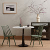 French-industrial meets bistro table. Detailed, 8-sided cast iron pedestal supports a dramatic white marble top with bull-nosed edge.
