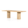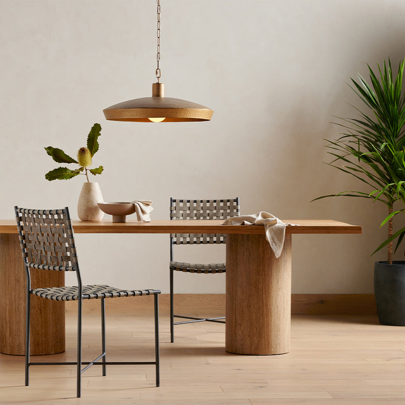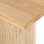 Make a mixed material statement. Cylindrical legs of solid travertine provide a dramatically scaled base for a rectangular tabletop of solid natural oak, for a fresh twist on organic Seventies styling. Seats six comfortably.