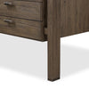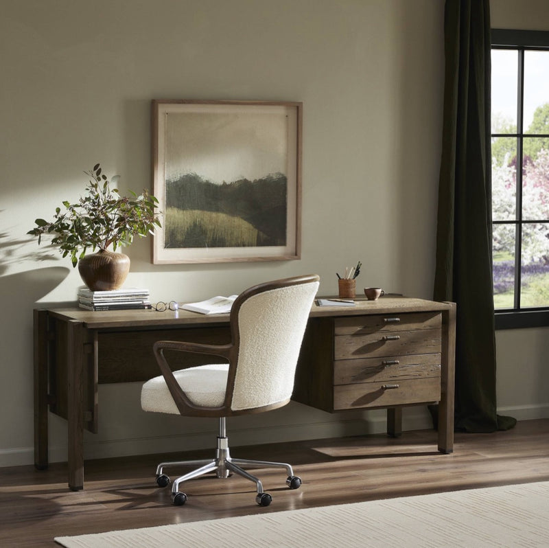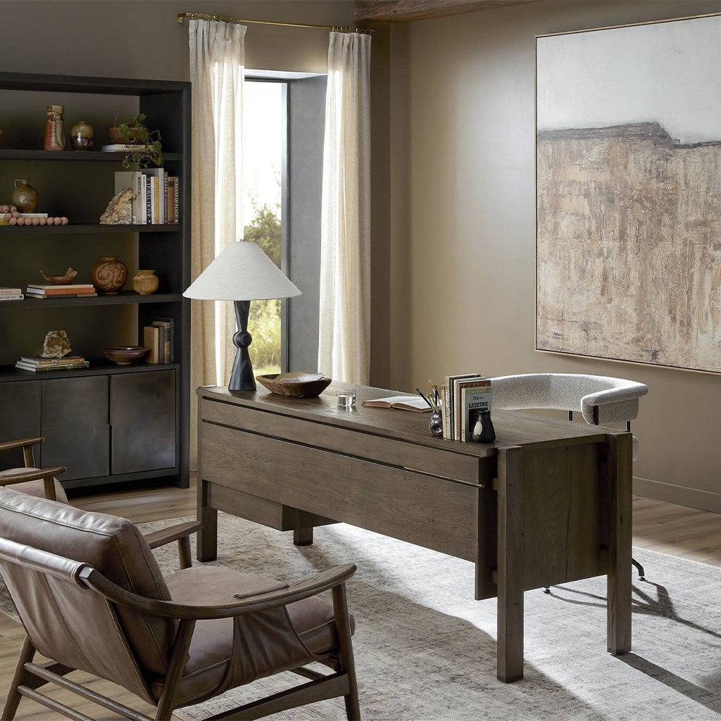 Made from reclaimed French oak, a unique open frame design crafts a light look, while dark brass hardware adds warmth. Versatile grey finish, plus four drawers for generous storage space. Designed in partnership with longtime Four Hands collaborator Thomas Bina and Brazilian designer Ronald Sasson.