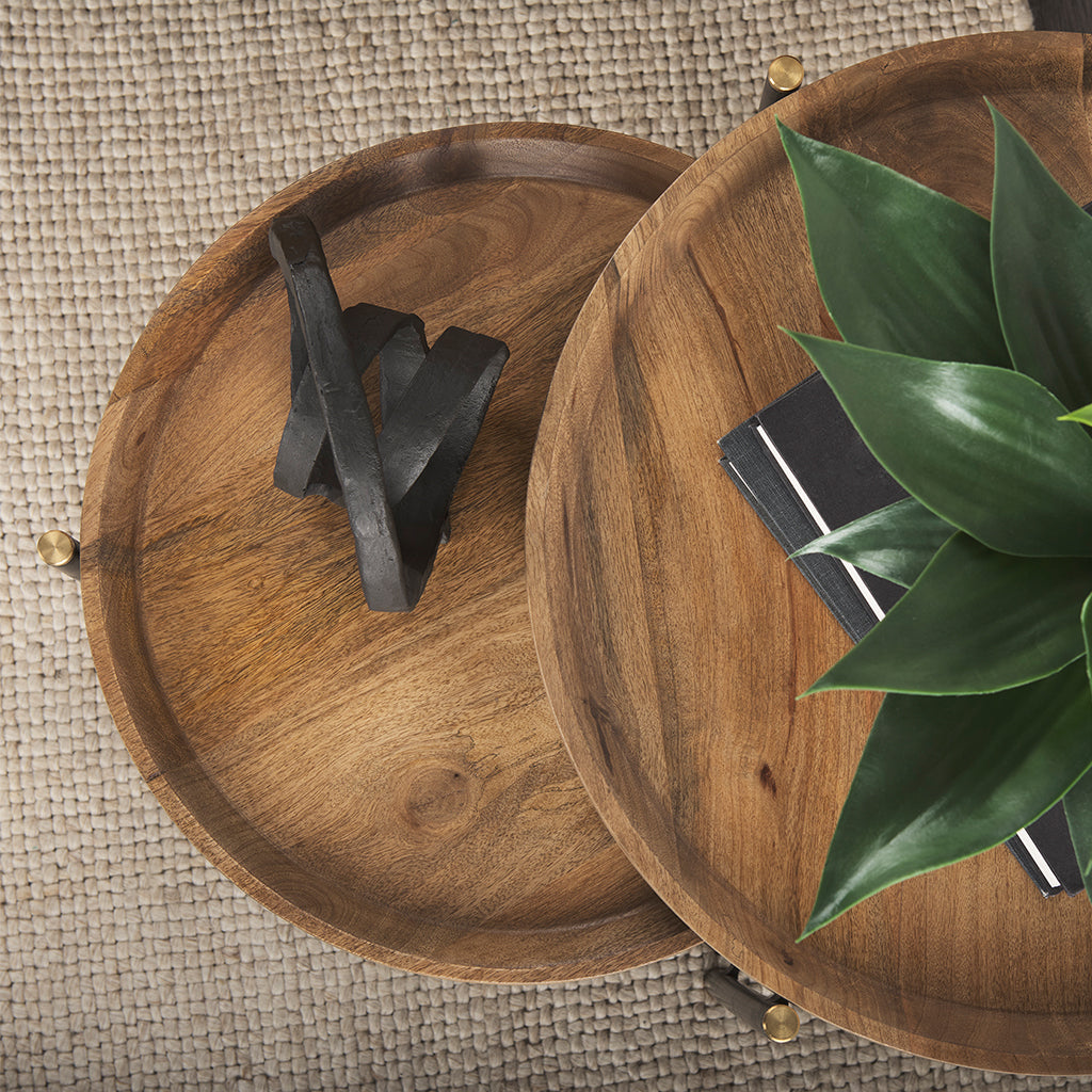 - Solid Wood and Metal Construction: Simple yet stylish, these versatile side tables feature tripod-shaped, iron frames beneath round, Mango wood, tray tops.