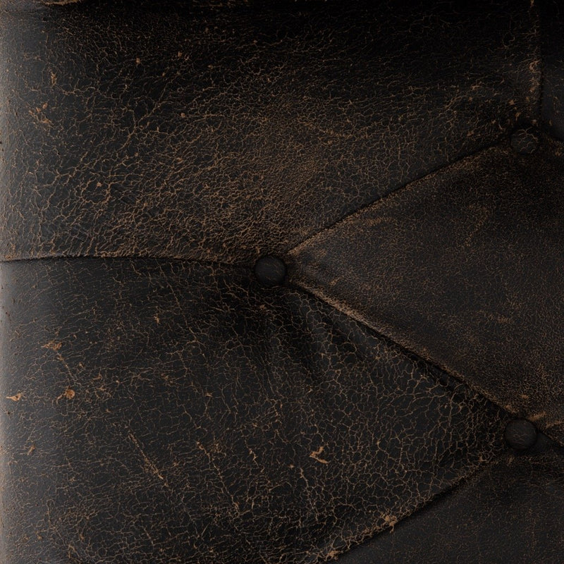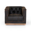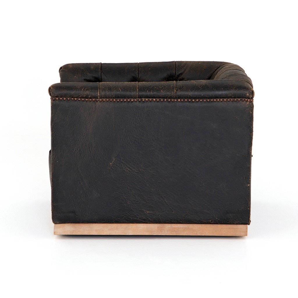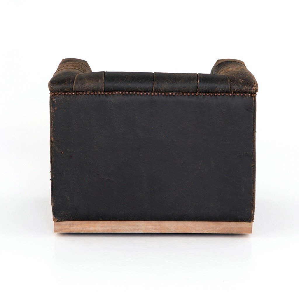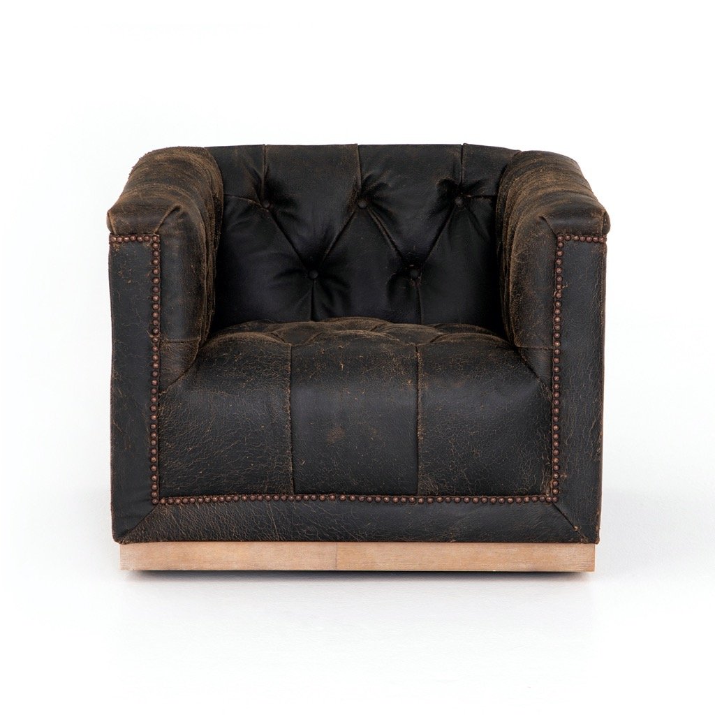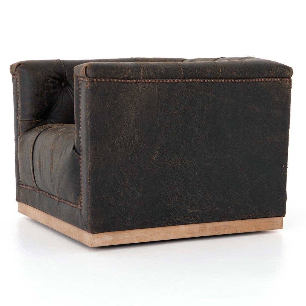 A modern take on the classic library chair. Covered in black top-grain leather and finished with a specially designed formula that creates intentional cracking and distressing for a naturally aged look. Mounted on a smooth swivel base of weathered oak and finished with aged bronze nailheads.
