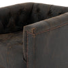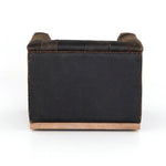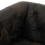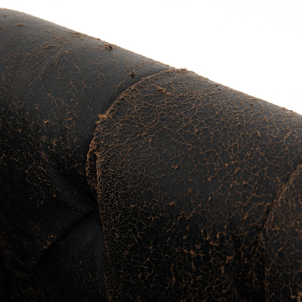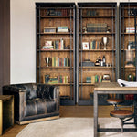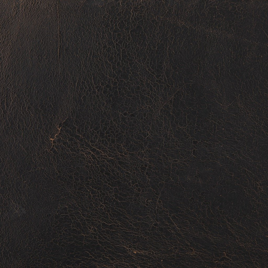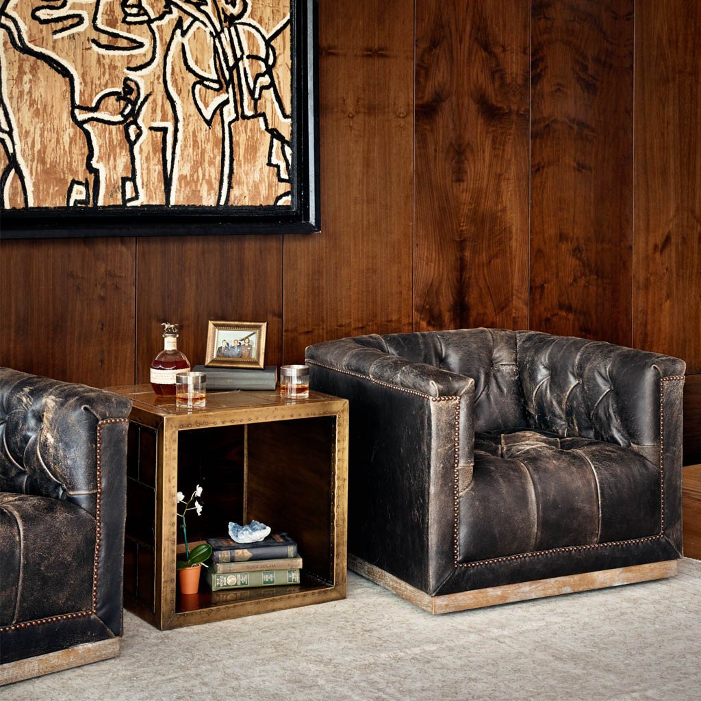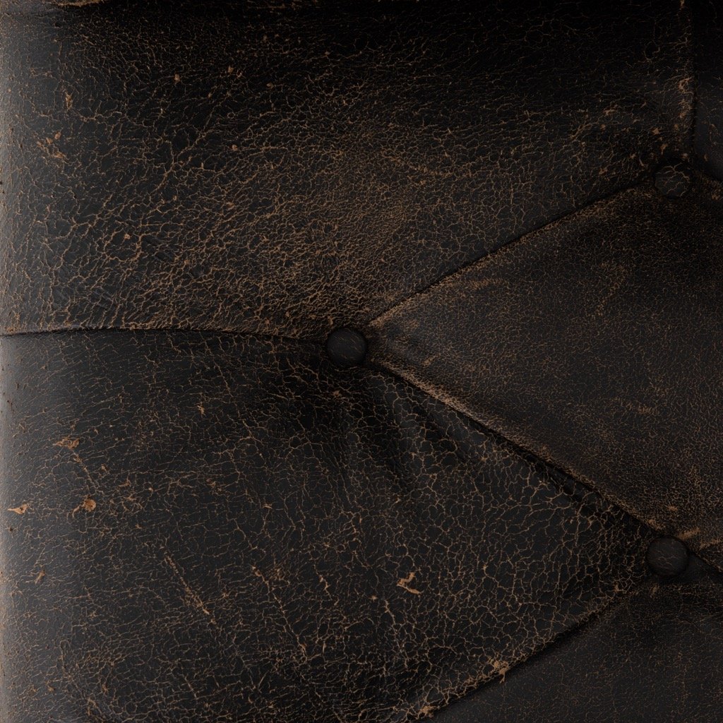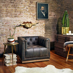 A modern take on the classic library chair. Covered in black top-grain leather and finished with a specially designed formula that creates intentional cracking and distressing for a naturally aged look. Mounted on a smooth swivel base of weathered oak and finished with aged bronze nailheads.