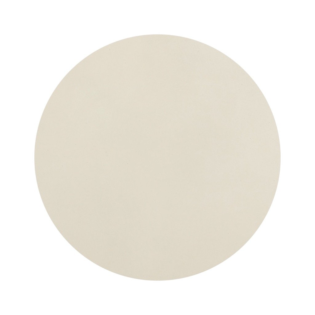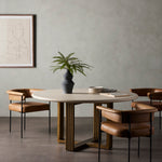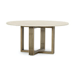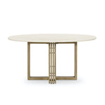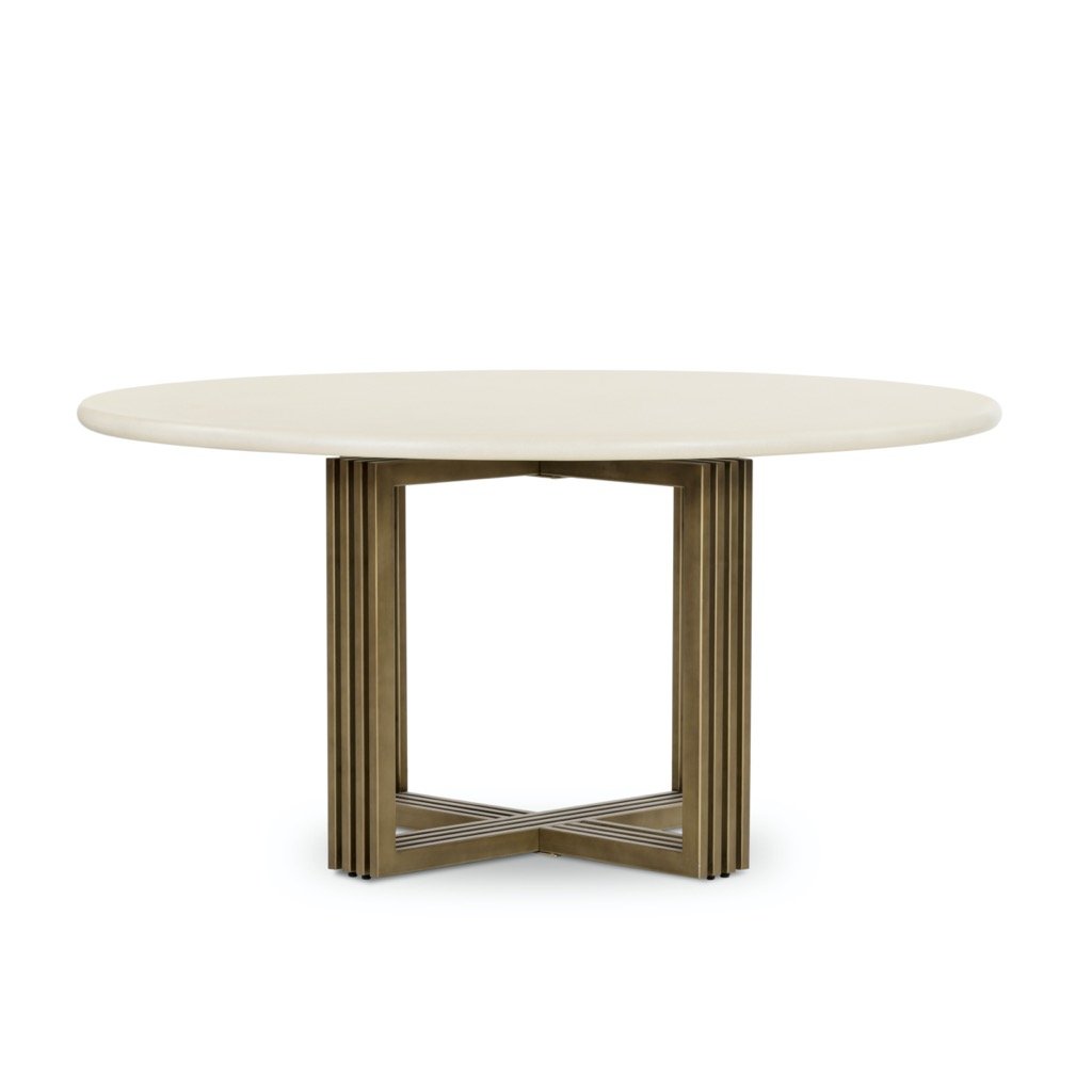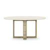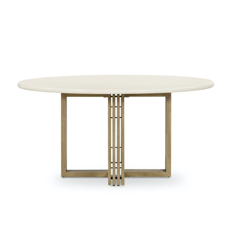 Bring a noble sense to the table. Banded legs of brass-finished steel support a rounded tabletop, as a high-gloss sheen enhances the natural texture and tone of white concrete.