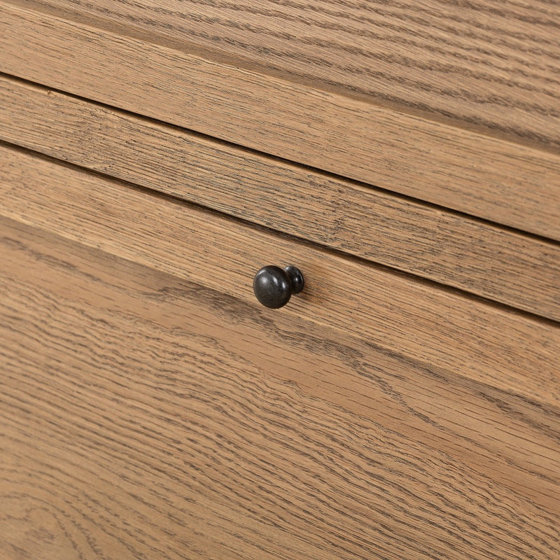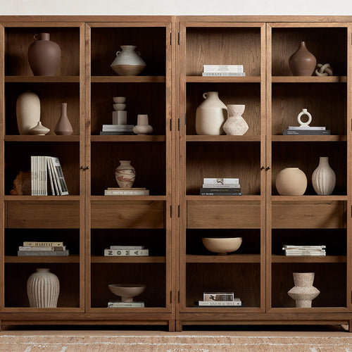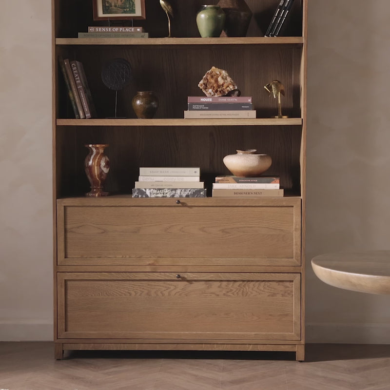 Light oak frames lighter interior shelving, for eye-catching contrast. Four surfaces showcase favorite books and treasures, while lower drawers bring bonus space to store items out of sight.
