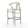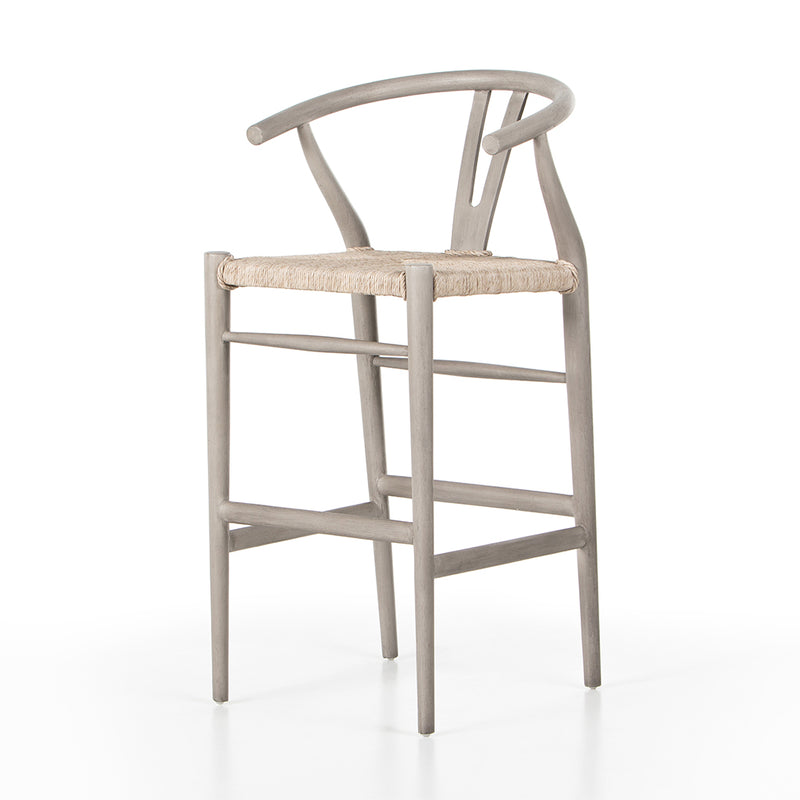 Modern curves redefine the classic wishbone-style counter stool. Vintage white all-weather wicker is woven for a dose of fresh texture within weathered grey teak framing. Cover or store indoors during inclement weather and when not in use.