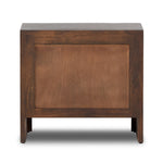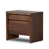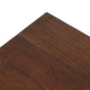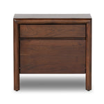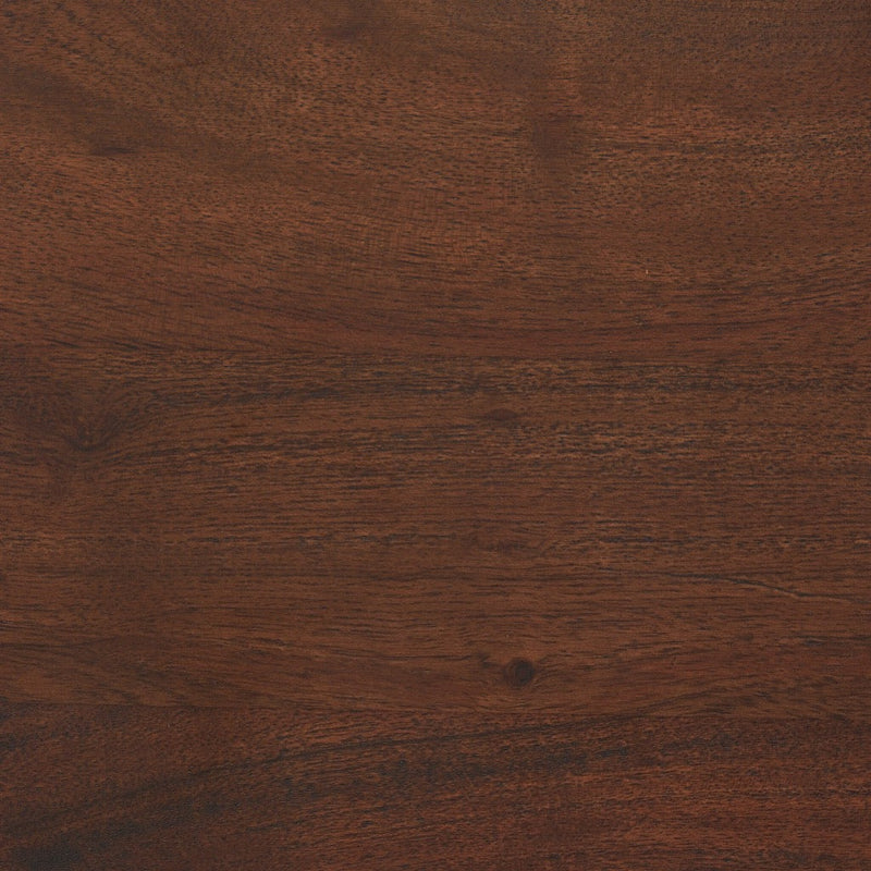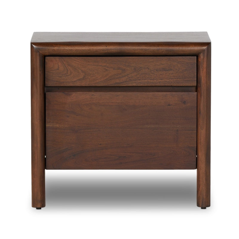 A faux live edge lends natural character to the waterfall frame, its mitered corners enhancing the seamless silhouette. Soft volumes and thick proportions exude a sense of permanence, while chamfered drawer pulls add refined functionality. The warm wood tones celebrate acacia's rich grain patterns.