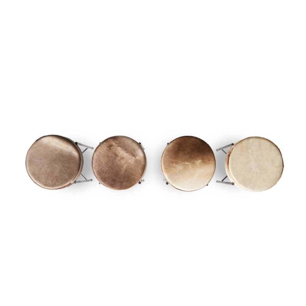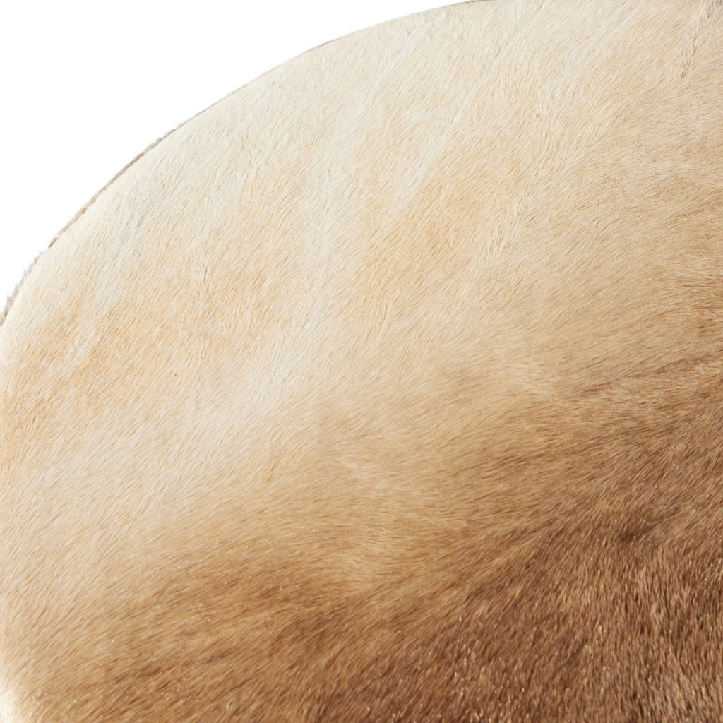 Slim and airy, gunmetal-finished iron legs form a cradle-style frame for speckled hide seating, perfectly sized for the counter. No two hides are the same. A variance in hide color, shape, pattern and hair length is to be expected, reflective of natural materials.
