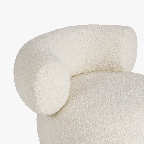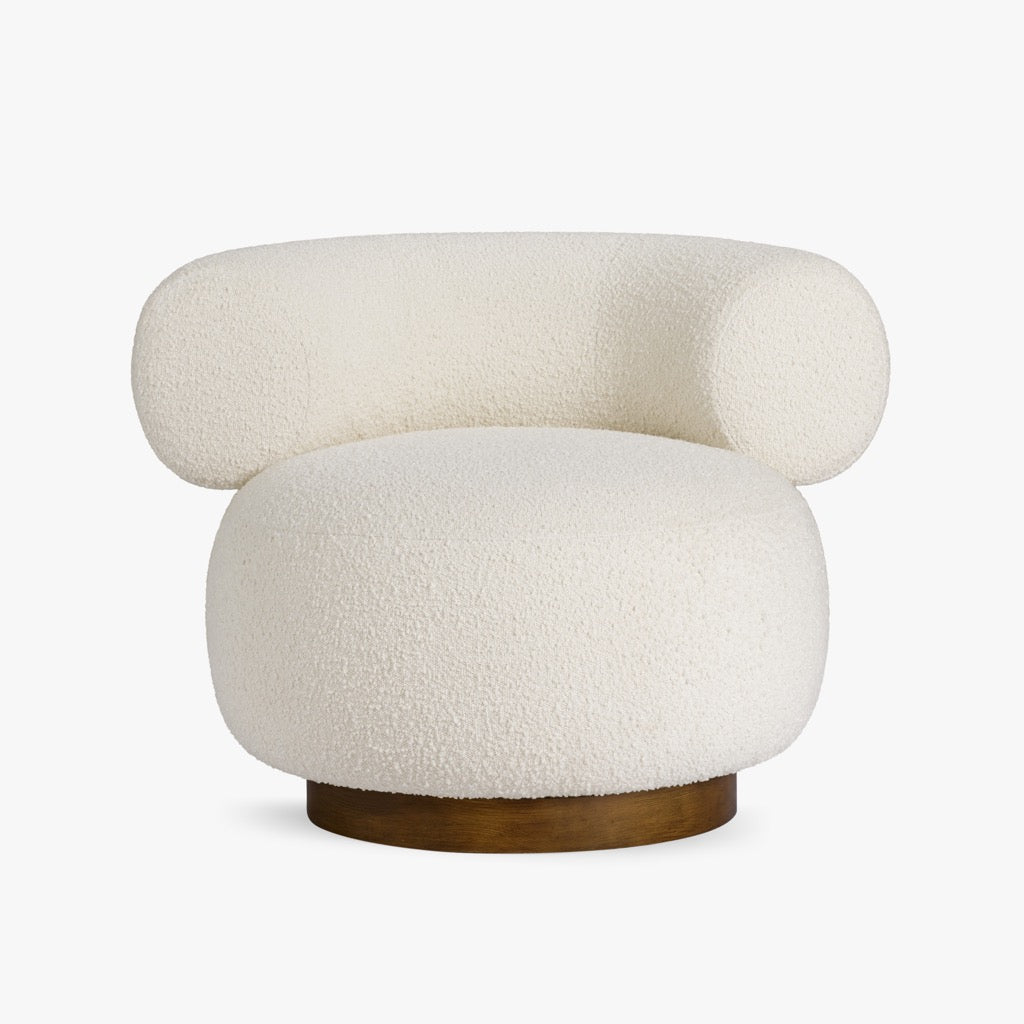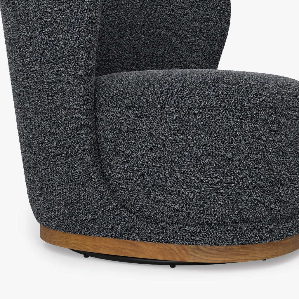 The Odell swivel chair is a modern take on the classic wingback silhouette, with a molded back frame offering a cozy, enveloping feel. The swivel base is hidden beneath a solid wood plinth, finished in walnut.