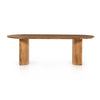 A study in shape. Sand-colored acacia forms crescent-shaped legs and a sprawling oval tabletop, bringing grand, organic-infused presence to the dining room.