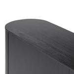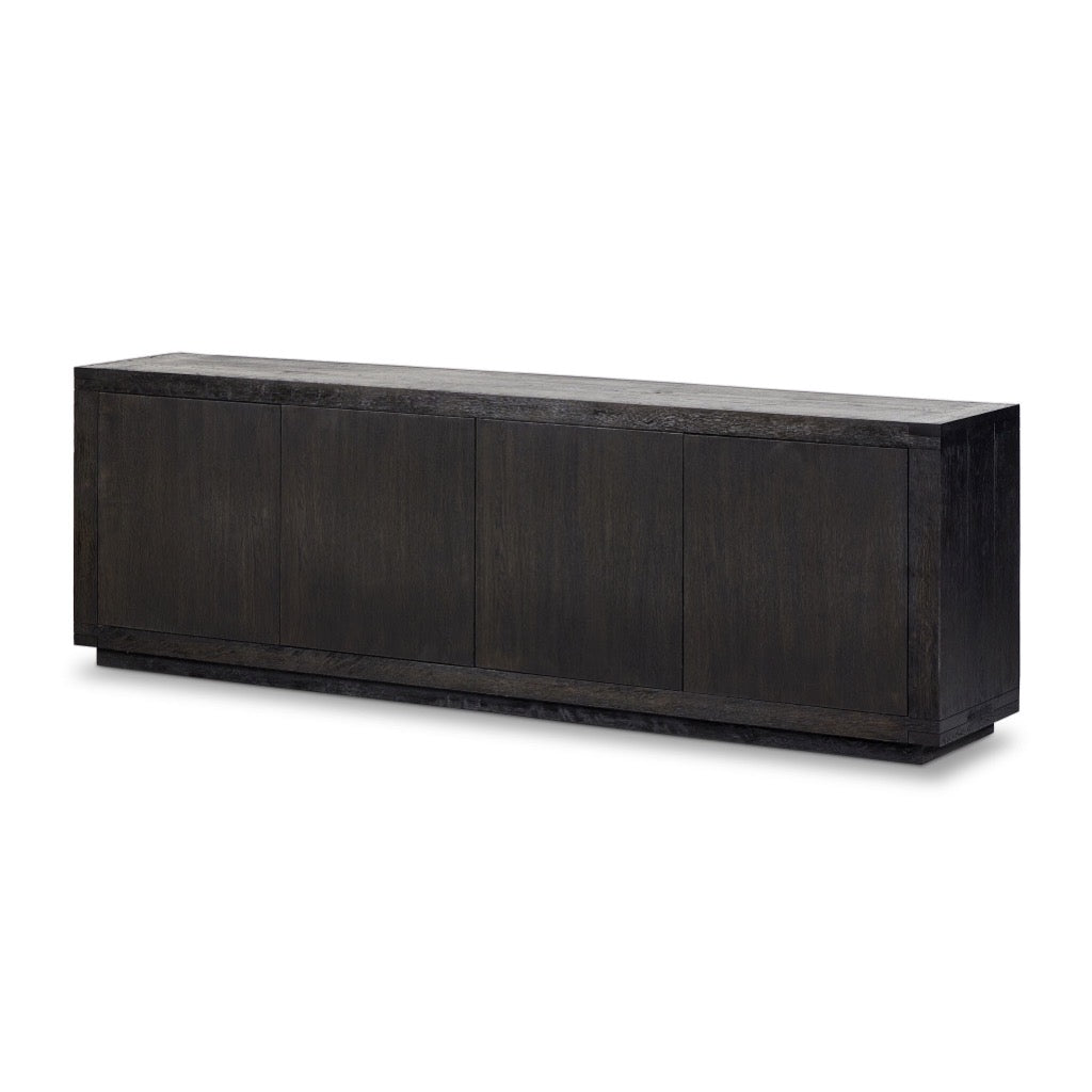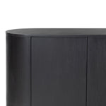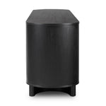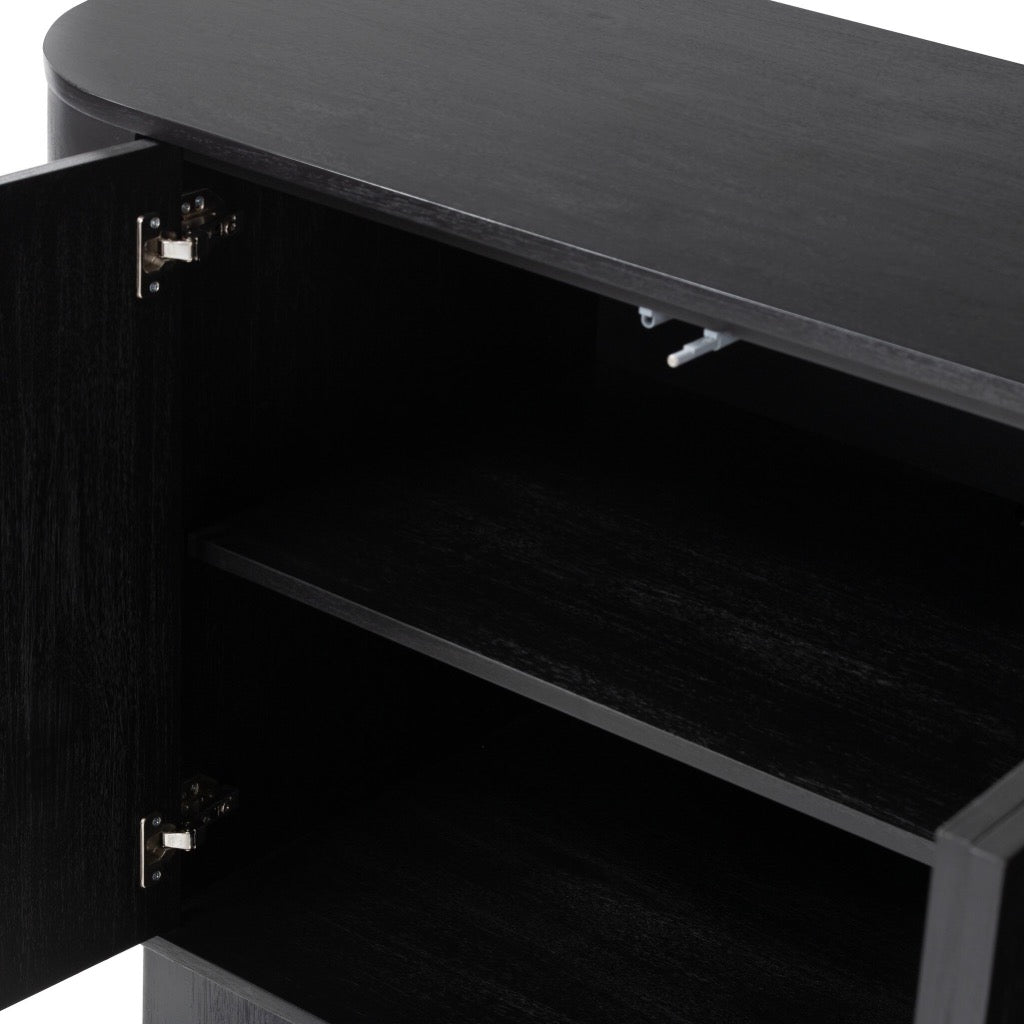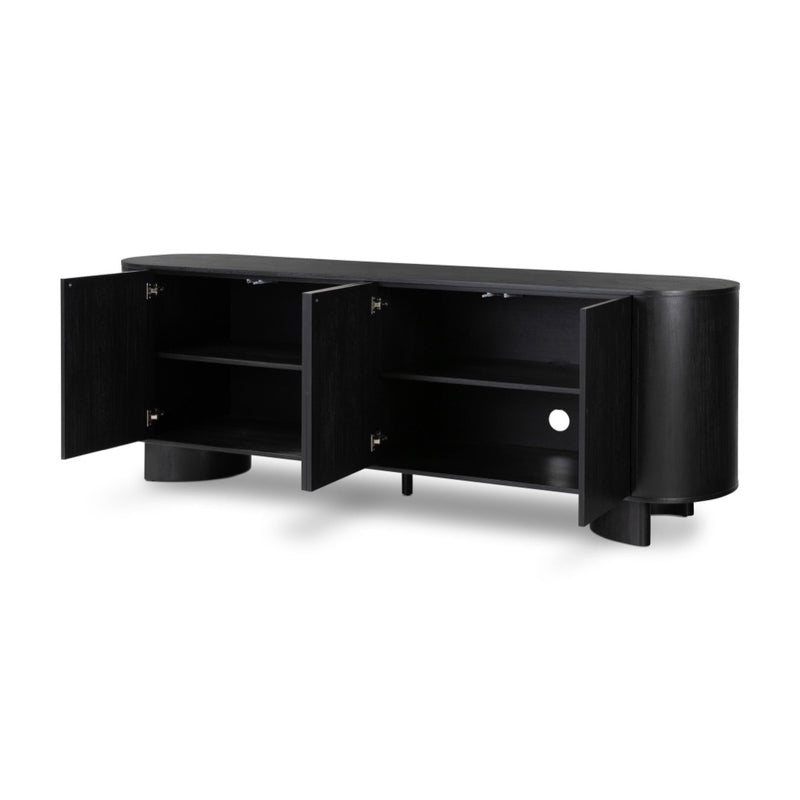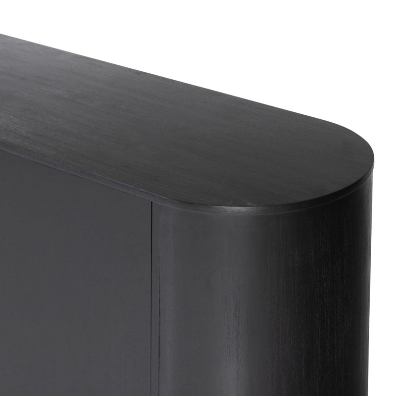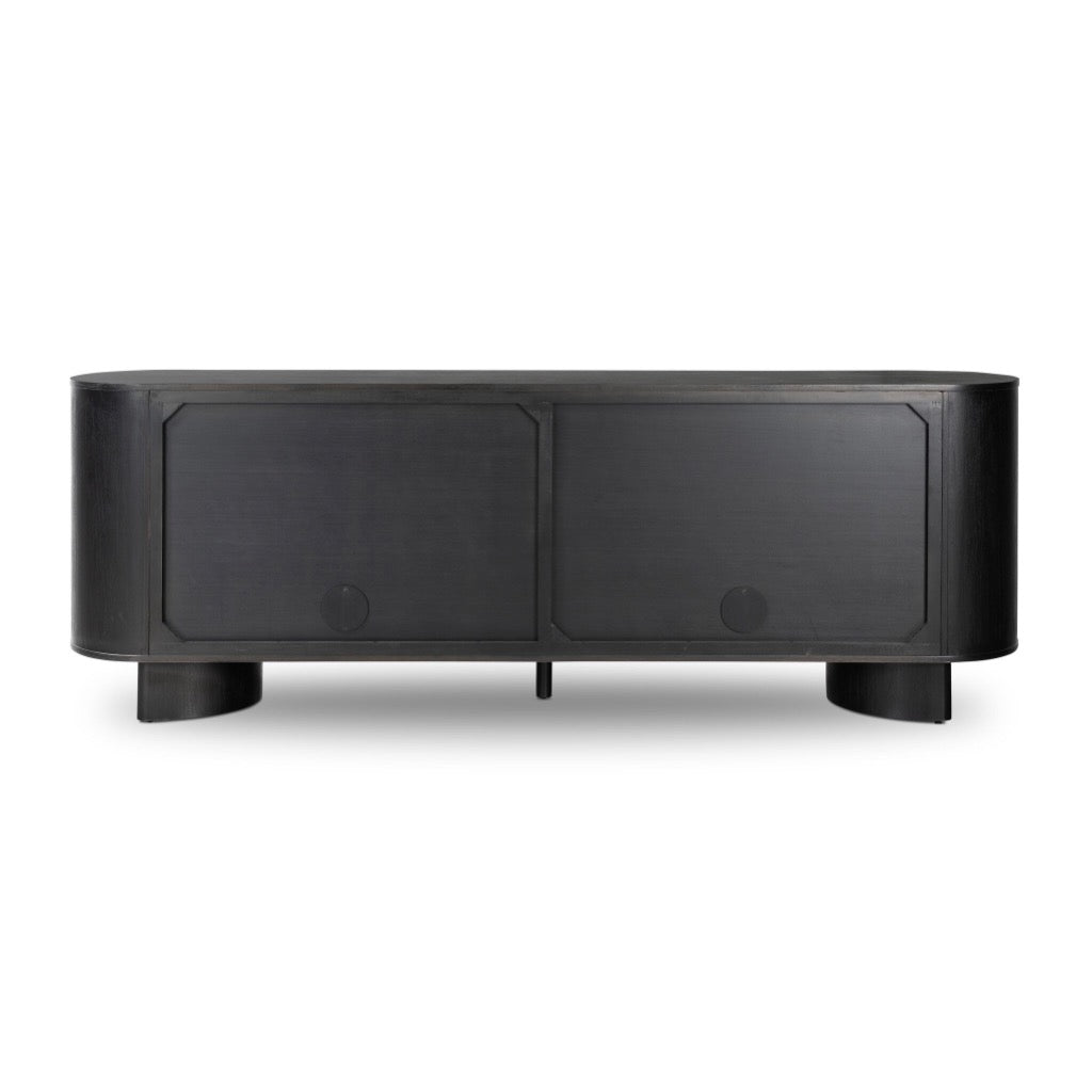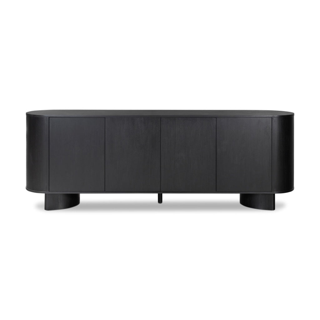 Aged black acacia forms curved legs and the cabinets of this sideboard. Generous interior space for dining storage needs and beyond.