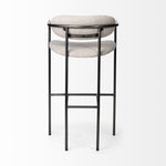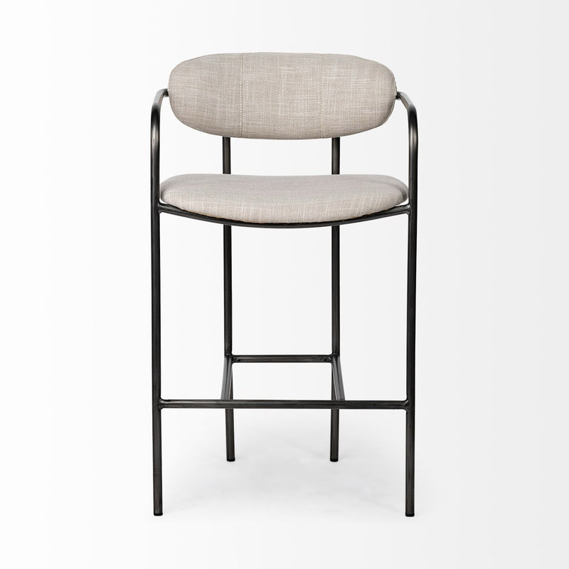 The Parker Stool is a simple yet stylish chair featuring a fabric-covered seat and back perched atop a sleek, four-legged metal frame.