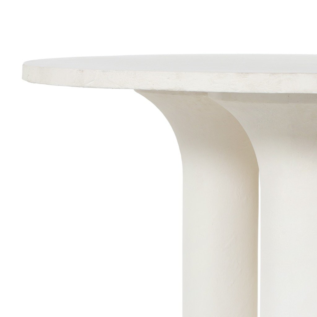 Made from plaster-molded concrete, a cylindrical pillar-style base tapers slightly to support a smooth white-finished tabletop for beautifully complementary texture. Indoors or out; cover or store inside during inclement weather and when not in use.