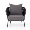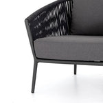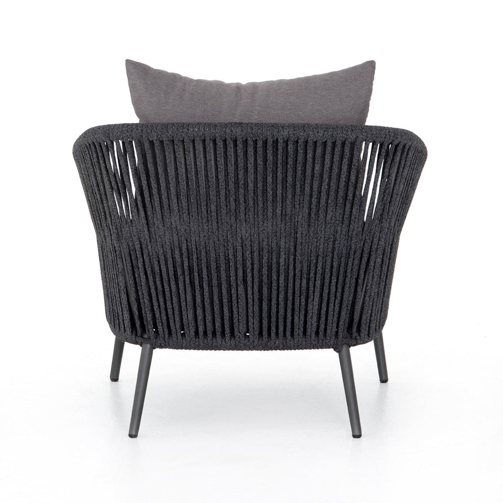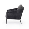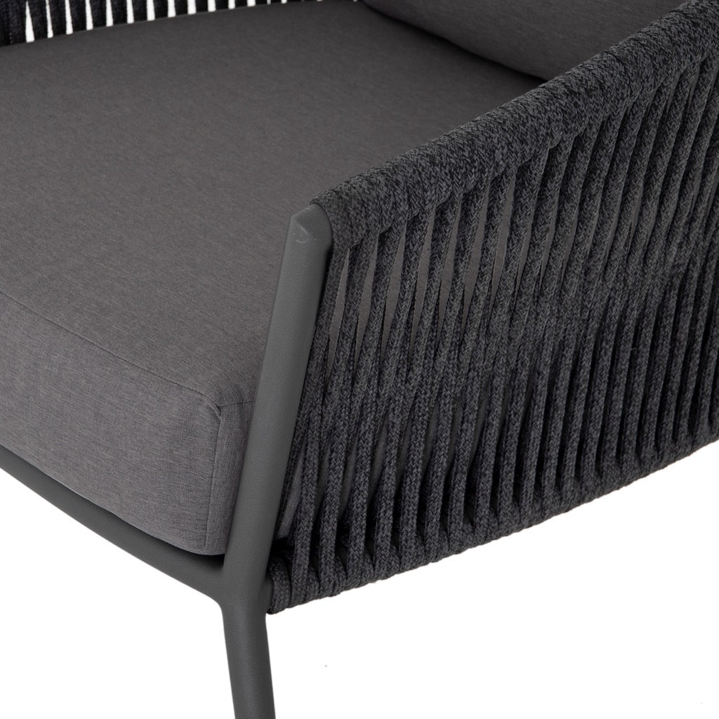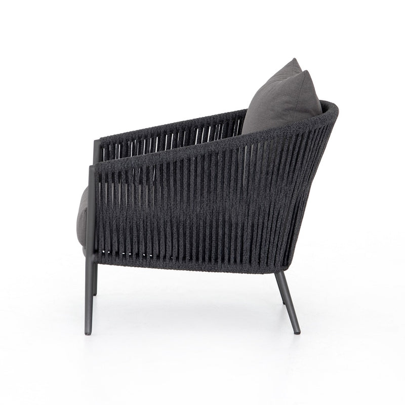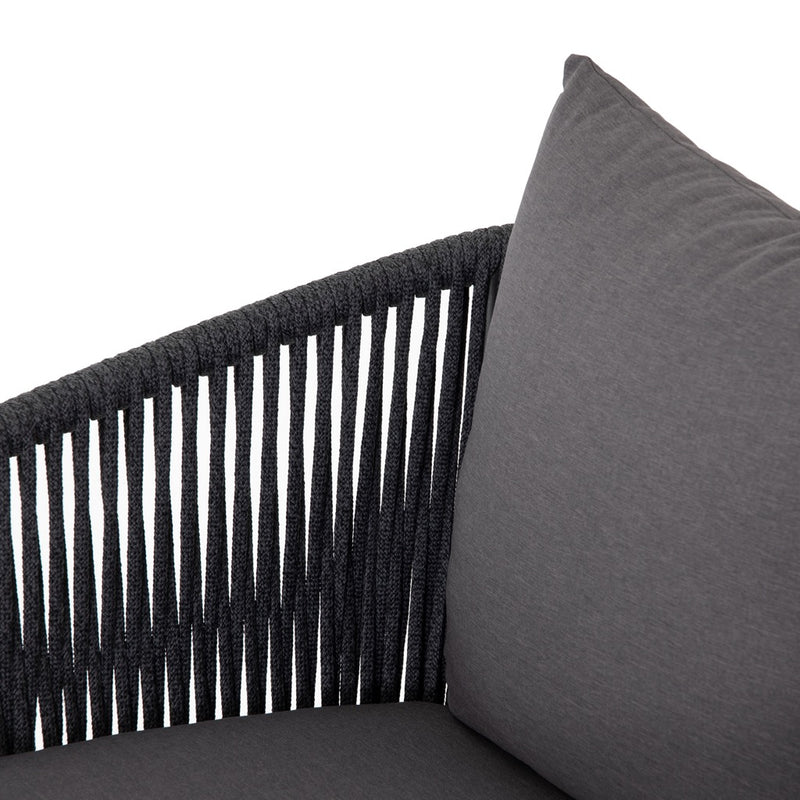 The perfect place for outdoor daydreaming. A beautiful rope-based design is woven across a durable aluminum frame in a rich bronze finish. Topped with a wide cushion and throw pillow, all upholstered in 100% Olefin, known for its UV-resistant, water-repellent and quick-drying abilities. Cover or store indoors during inclement weather and when not in use.