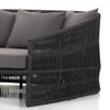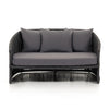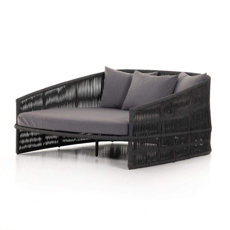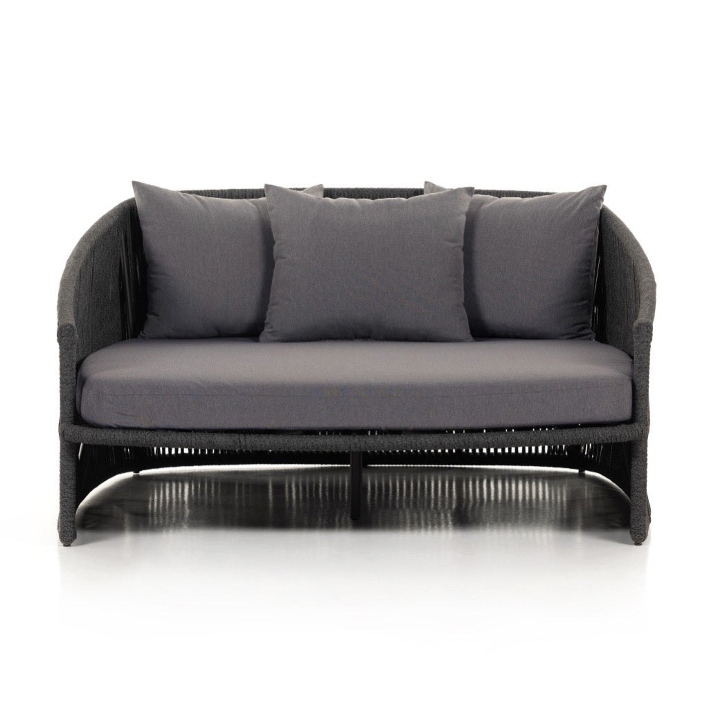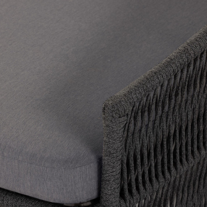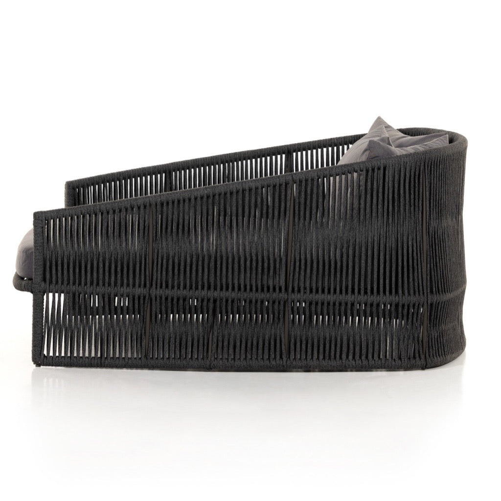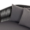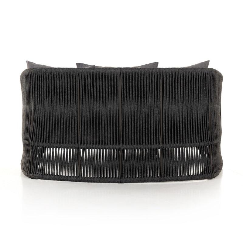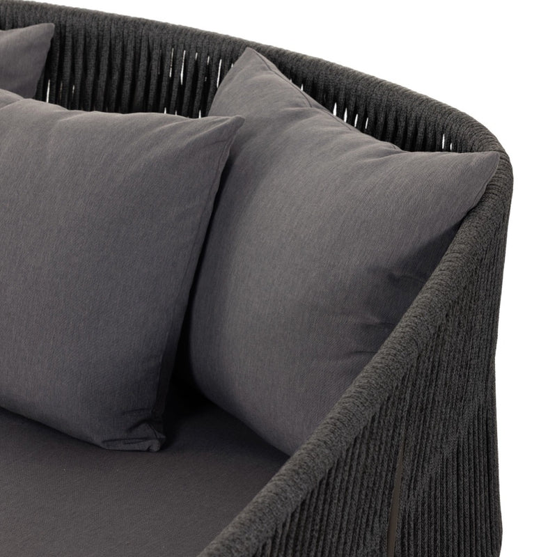 The perfect place for outdoor daydreaming. A beautiful rope-based design is woven across a durable aluminum frame in a rich bronze finish. Topped with a wide cushion and throw pillows, all upholstered in 100% olefin, known for its UV-resistant, water-repellent and quick-drying abilities. Cover or store inside during inclement weather and when not in use.