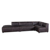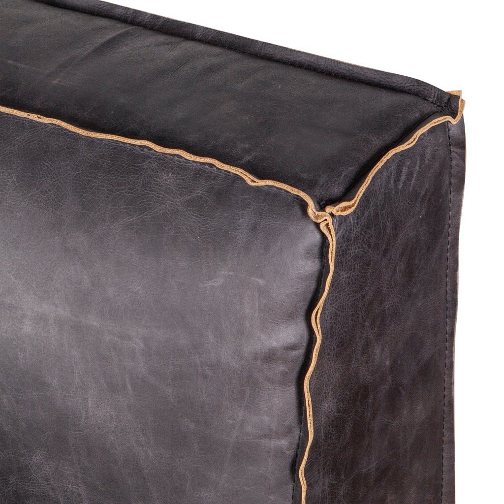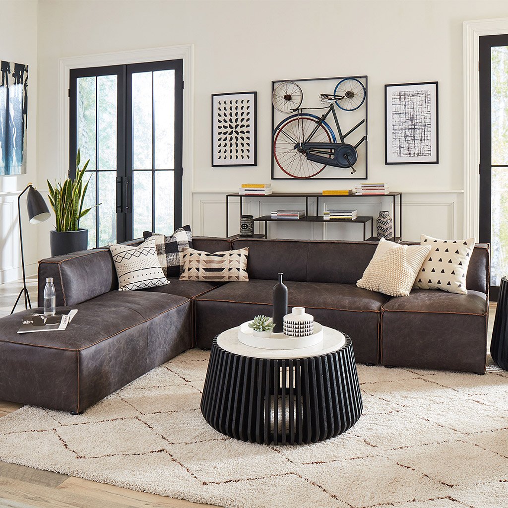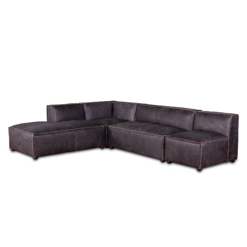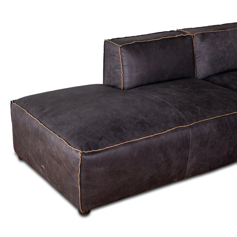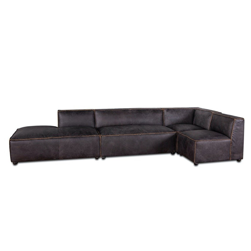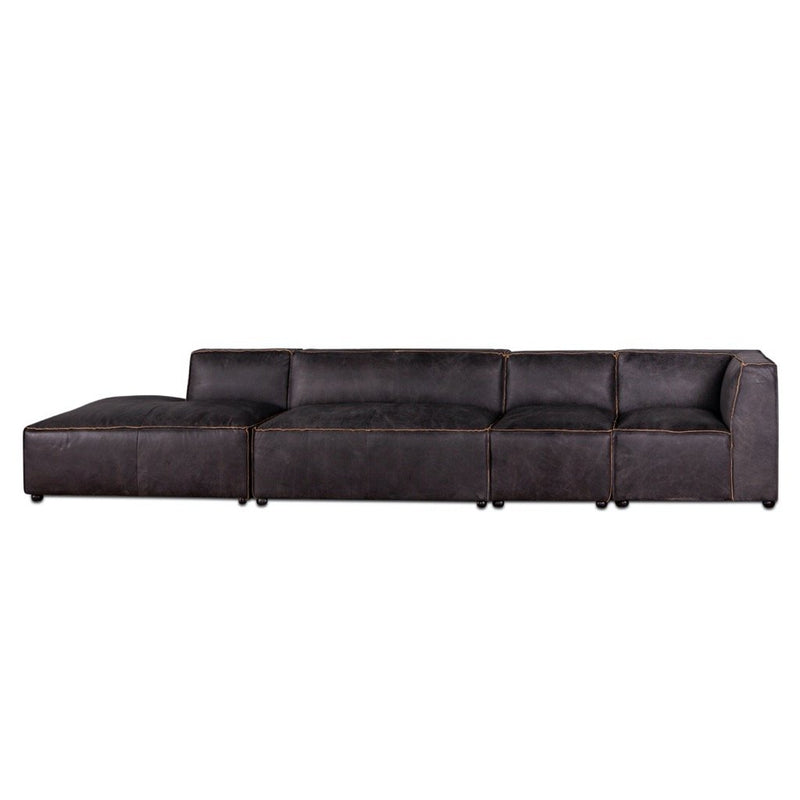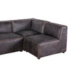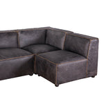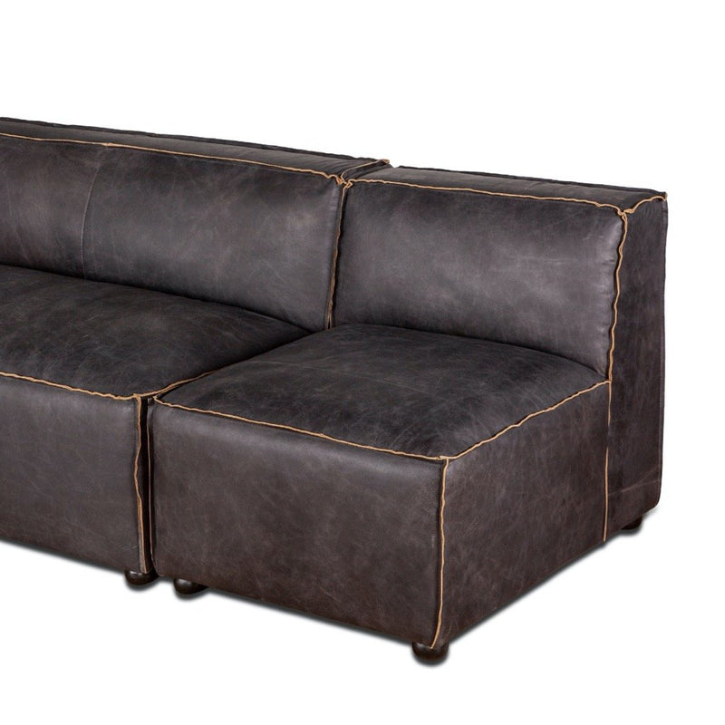 The distressed antique ebony leather seat of the sectional has a soft, luxurious feel, and the high density foam cushion and heavy gauge sinuous spring, all combine to provide ultimate comfort. The sectional is modular with four pieces including: armless chair, corner, armless loveseat, and half back chaise. Each piece of this modular sectional features two retractable hinged metal hooks that extend out from below allowing all pieces to be fastened securely together or to hide away when standing alone. This sectional requires no assembly.