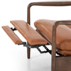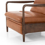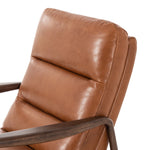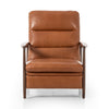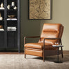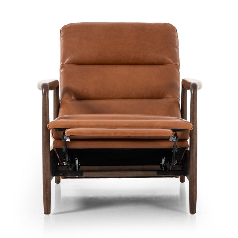A sleek seat with hidden push-back reclining functionality. This midcentury-inspired recliner features wide chunky channeling paired with slim paddle arms and a tapered wood frame. Designed with a high seat and high back for extra comfy support. Upholstered in a timeless tobacco-hued leather made in a family-owned tannery in Thailand.