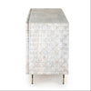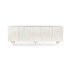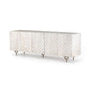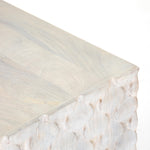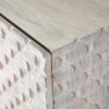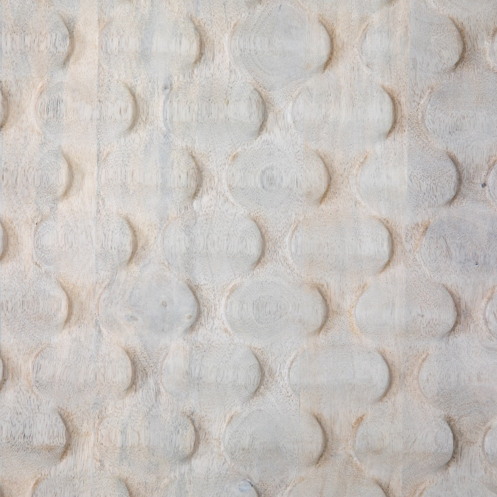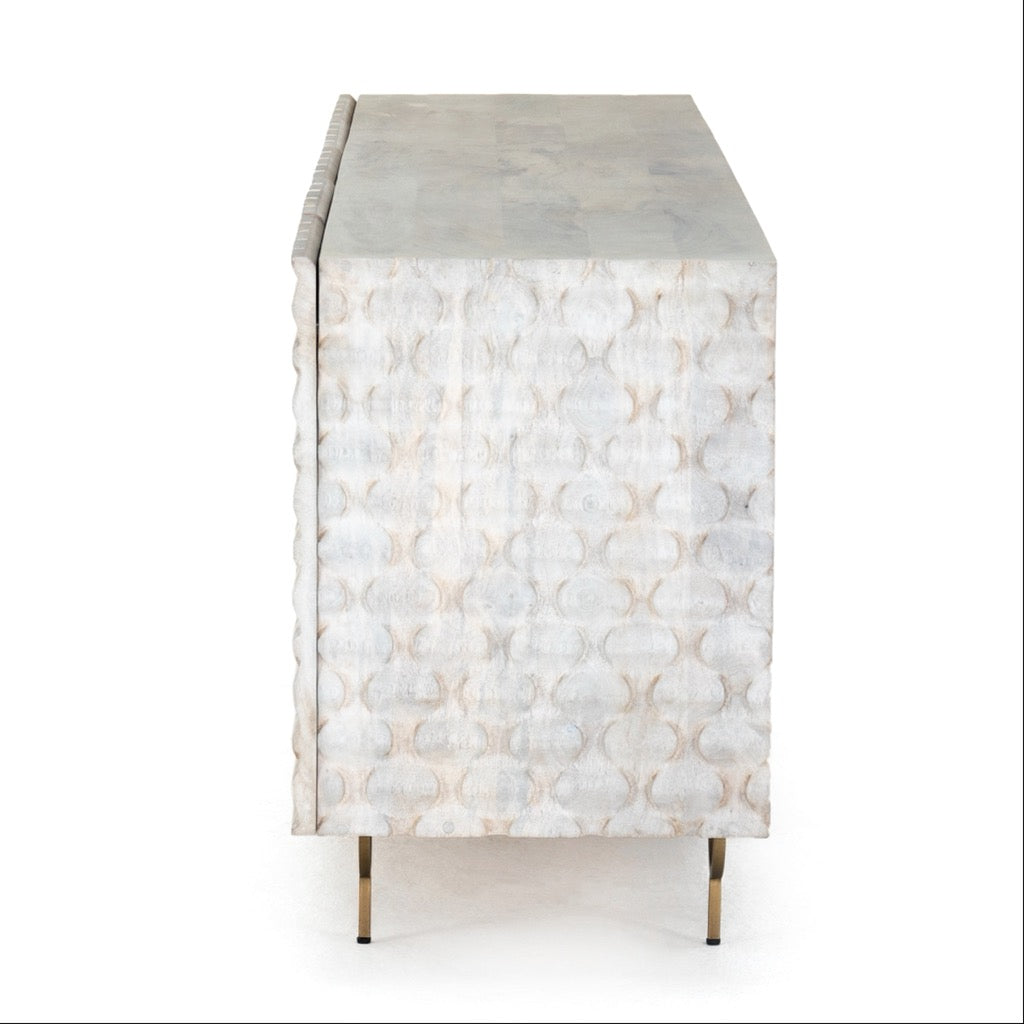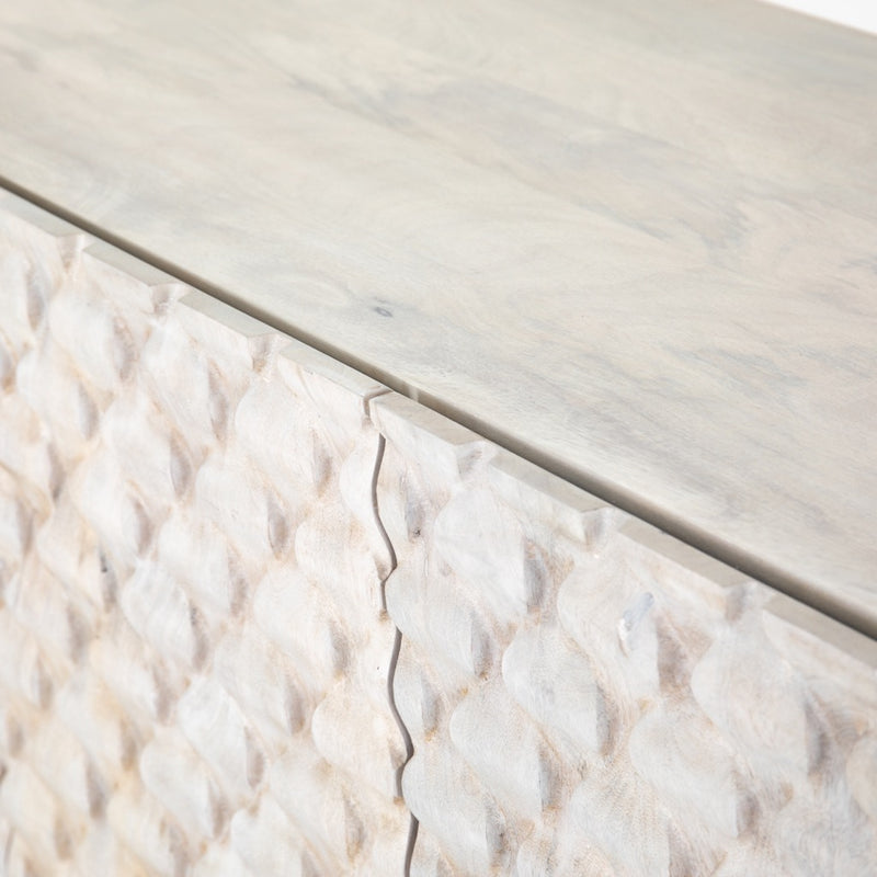 White-washed mango wood adopts intricate CNC carving for a uniquely textured look. Rounded iron legs offer an intriguing material mix with a modern touch. Spacious interior shelving for media, plus rear cutouts for cord management.