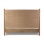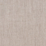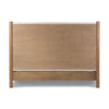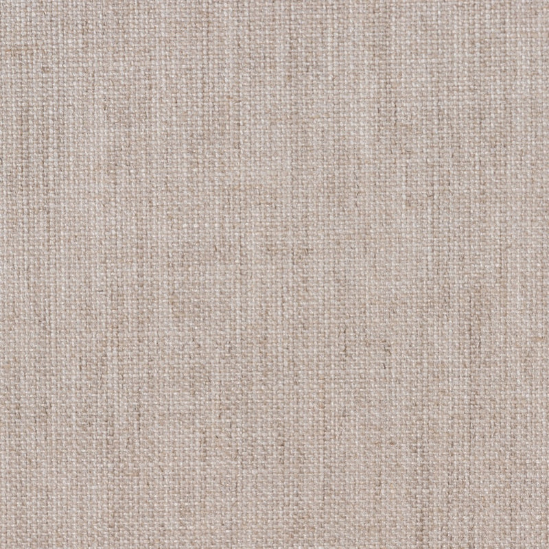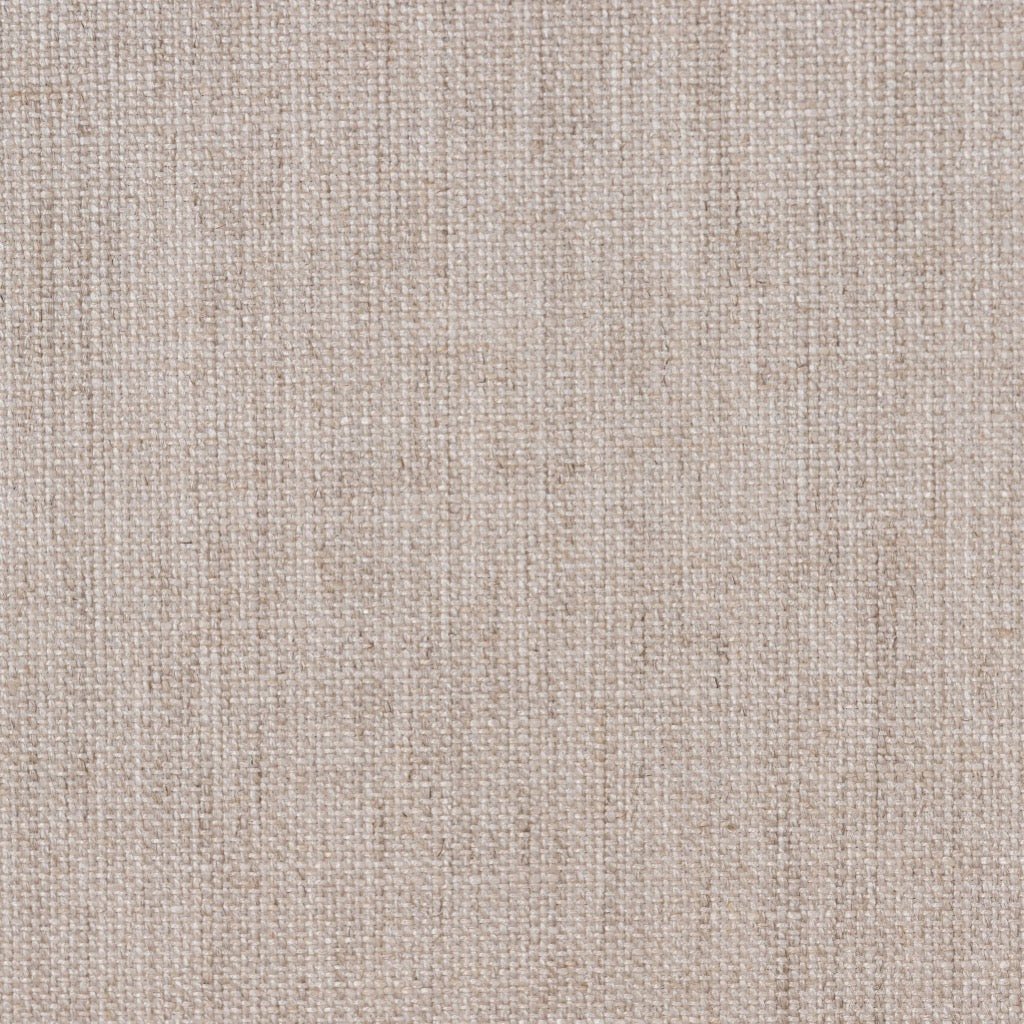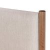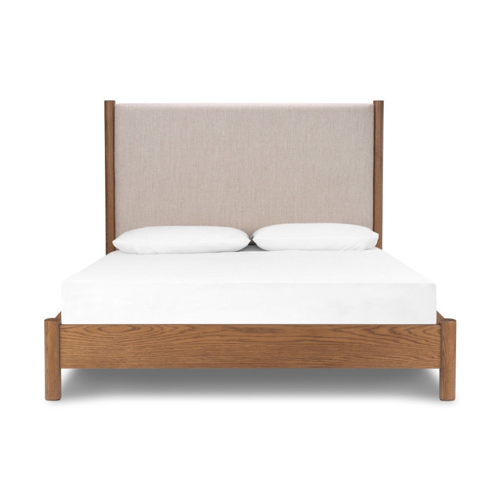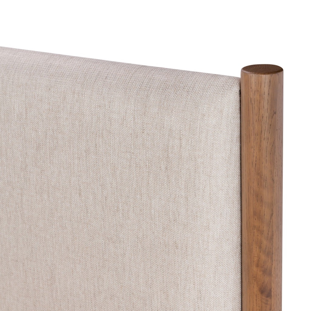Rounded, chunky dowel legs in an amber oak finish frame the neutral, linen-like upholstered headboard of this bed frame.