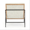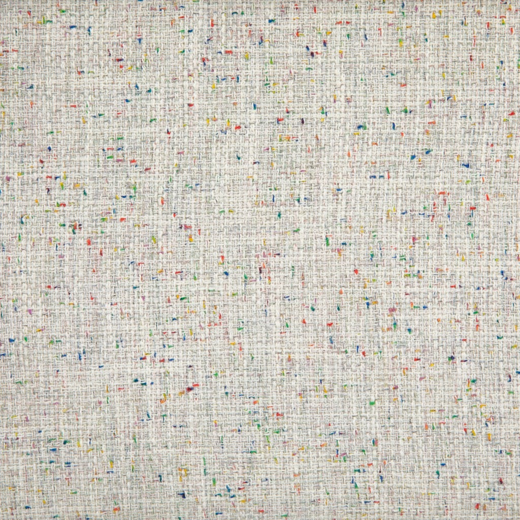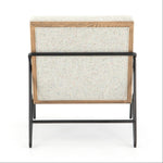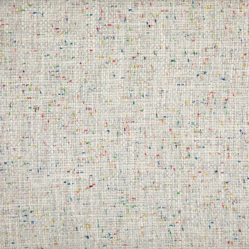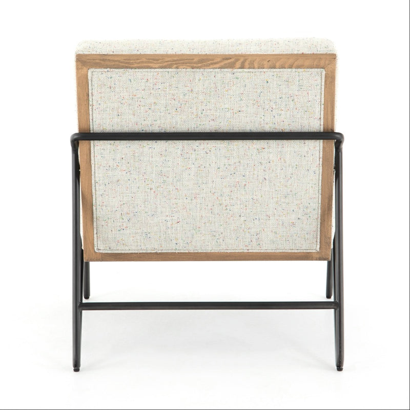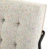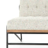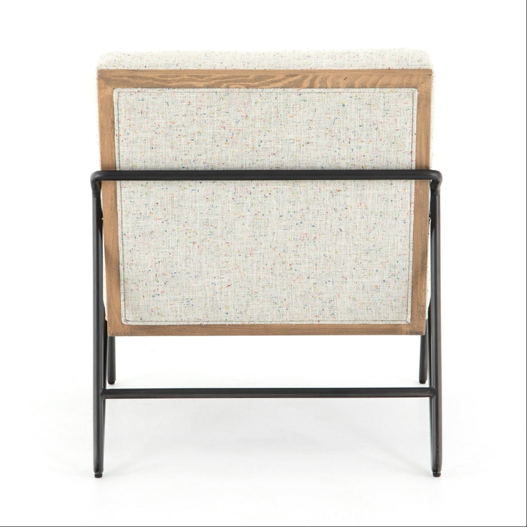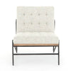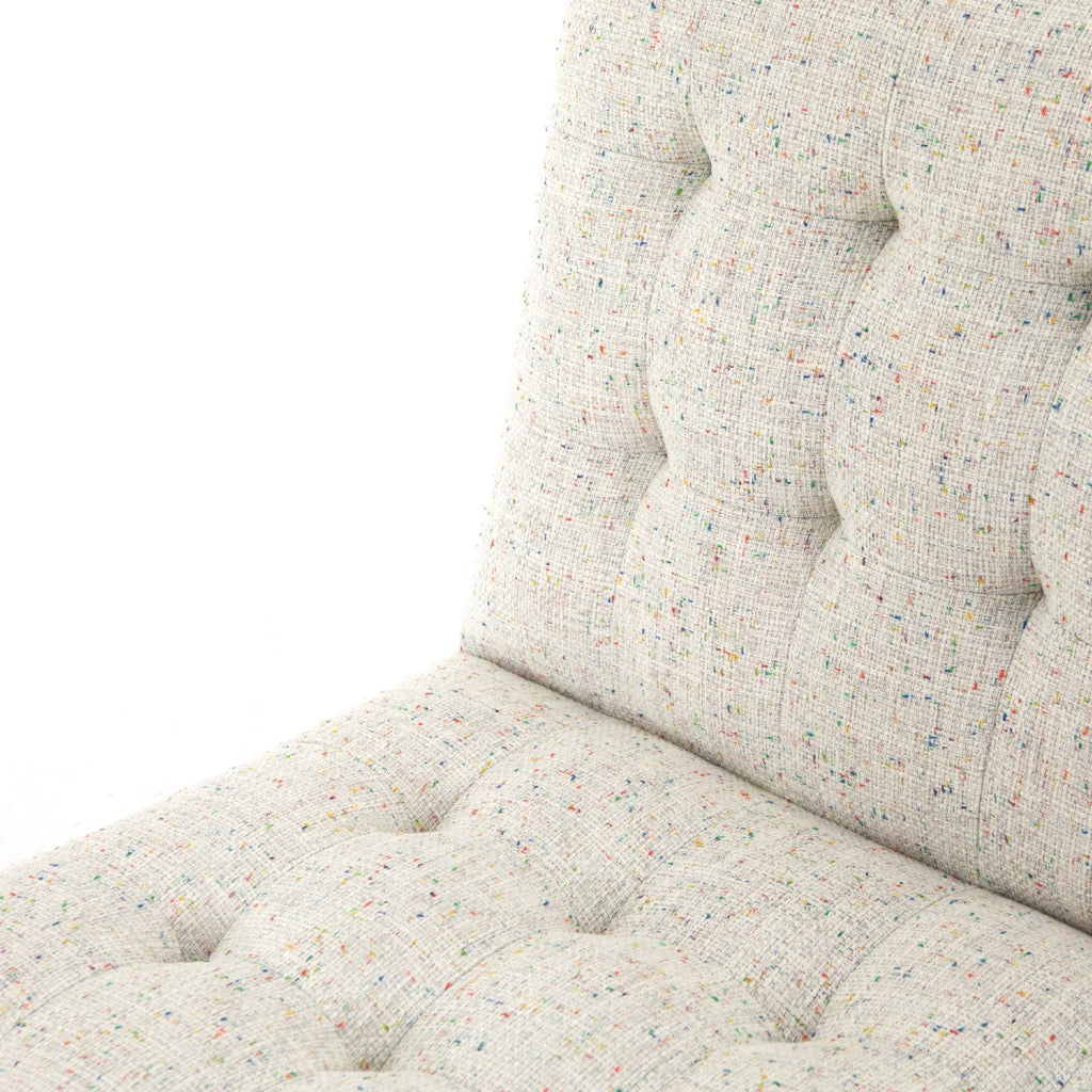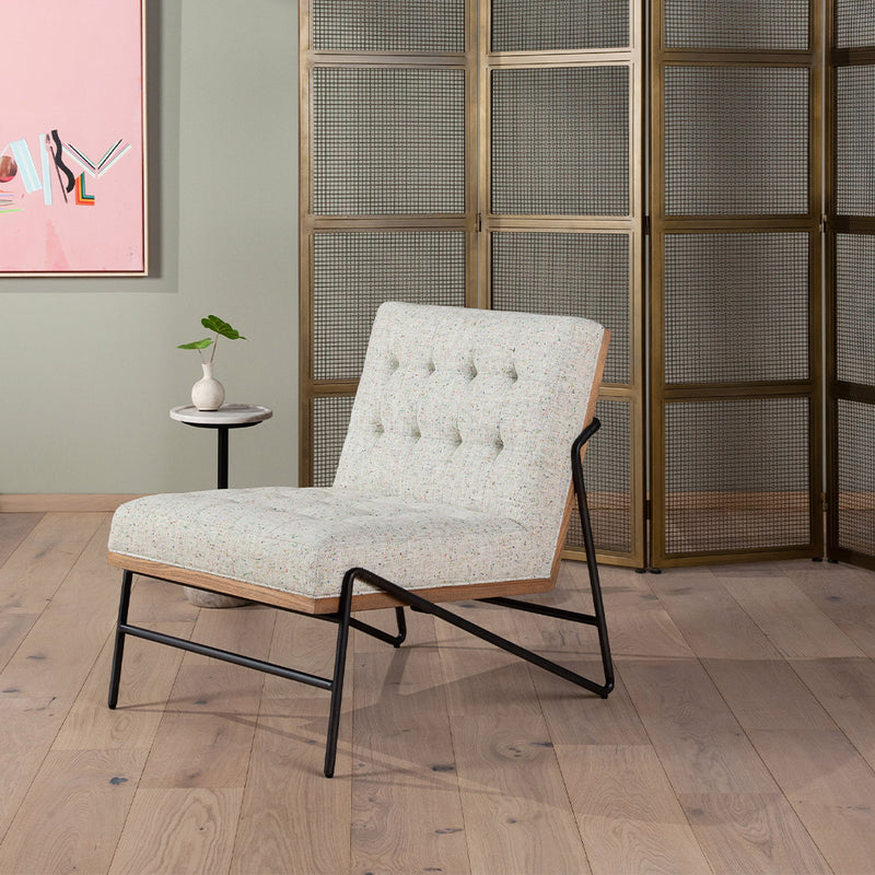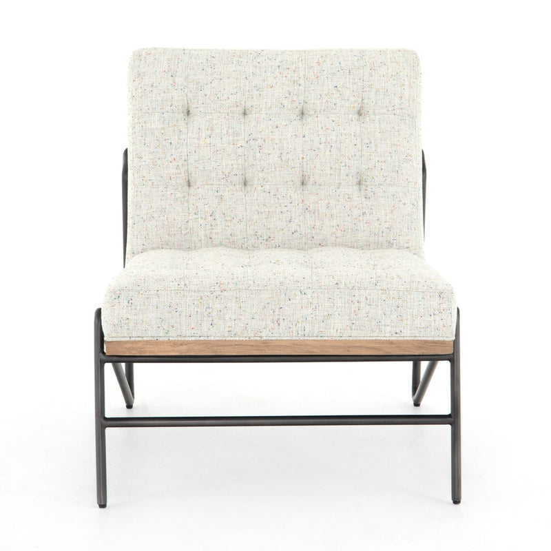 Angular black-finished iron forms a slim hairpin frame for armless seating, with button tufting for texture. Light neutral upholstery features subtle flecks of color for a fun, fresh touch.