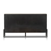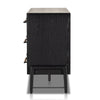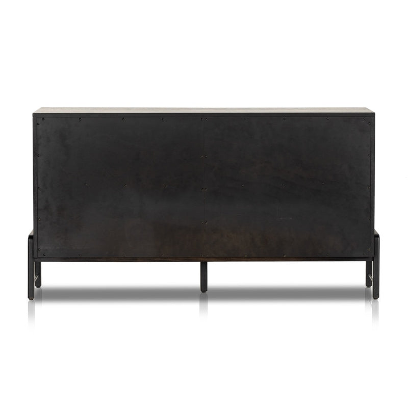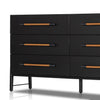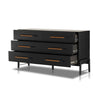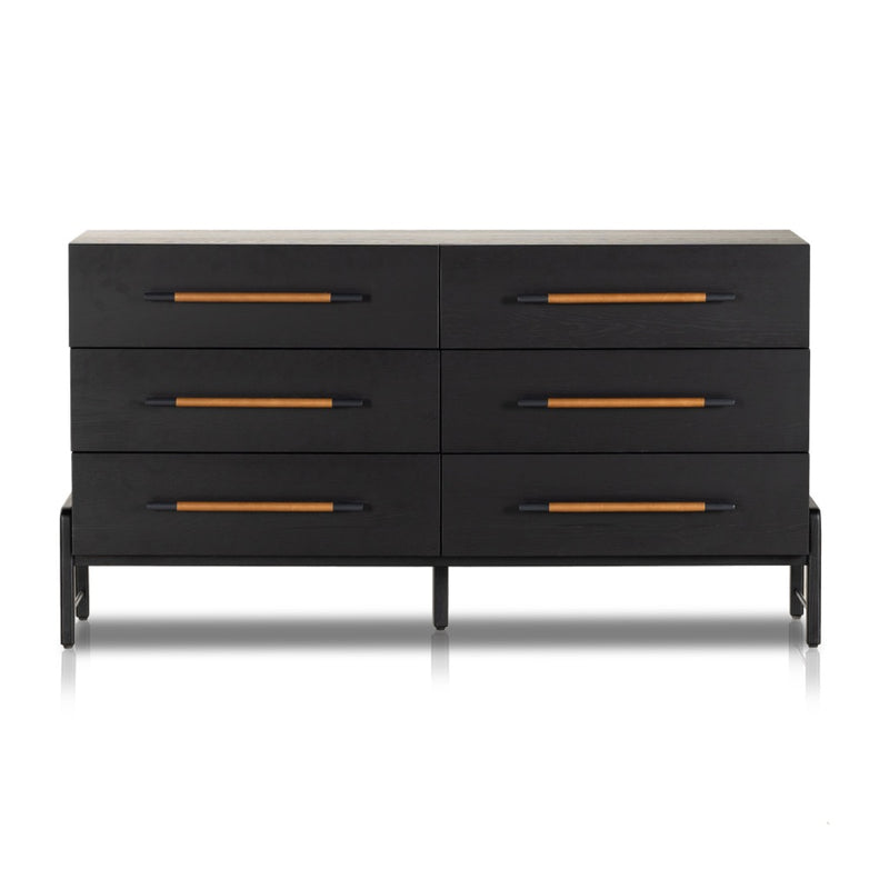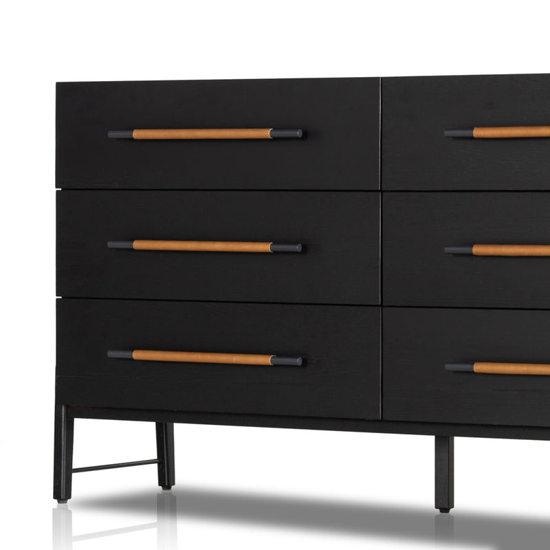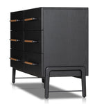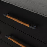 Ebony-finished oak forms a clean silhouette for six spacious drawers with iron hardware wrapped in tan top-grain leather.