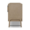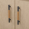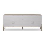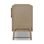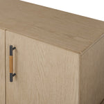 Accented with iron hardware wrapped in tan top-grain leather, light-finished oak veneer forms a clean silhouette with plenty of storage. Outset legs add an element of interest.