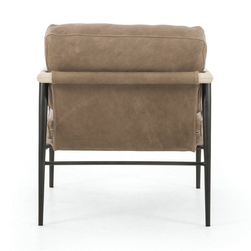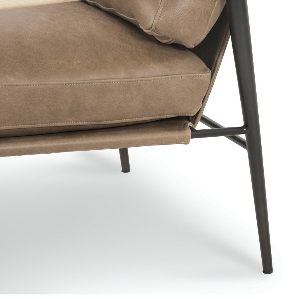 Slim, black steel frames buttery, pronounced seating of tan top-grain leather, with whitewashed ash accentuating angular arms.