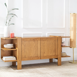 The Saguaro Oak Sideboard – a striking combination of functionality and sculptural design. Crafted from solid Oak, this sideboard features open shelving flanking a 2-door cabinet, offering both display space and concealed storage. Anchored by sculptural wide plank legs, the Saguaro Oak Sideboard is a visual delight that seamlessly blends form with purpose.