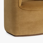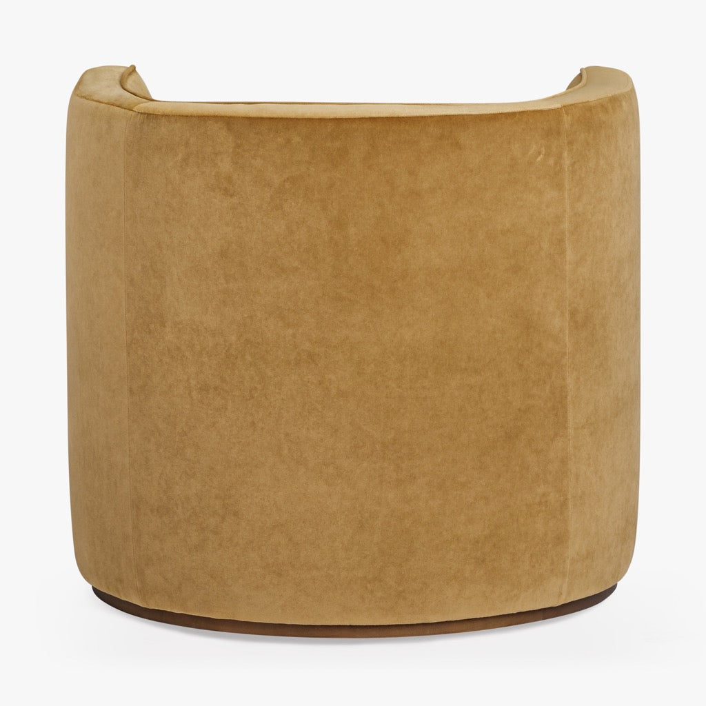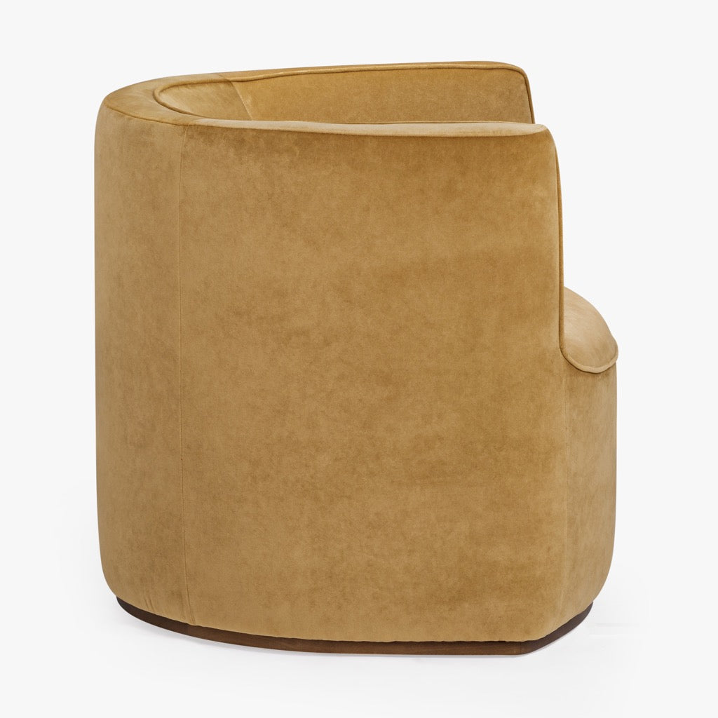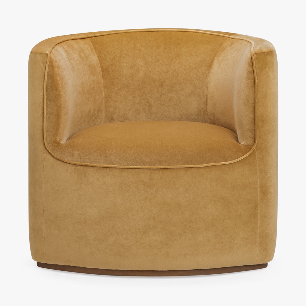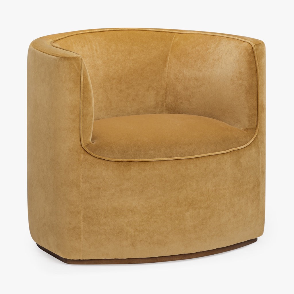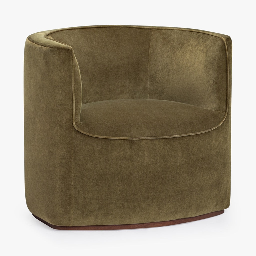 With its subtle curves and delicate piping detail, the Santo chair is a modern take on the classic barrel back chair. Manufactured using sinuous spring construction, the Santo chair is available in velvet balsam, nutmeg, or in a textured ivory boucle. The chair sits on a recessed plinth constructed of solid wood.