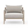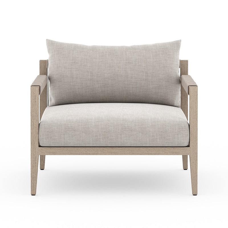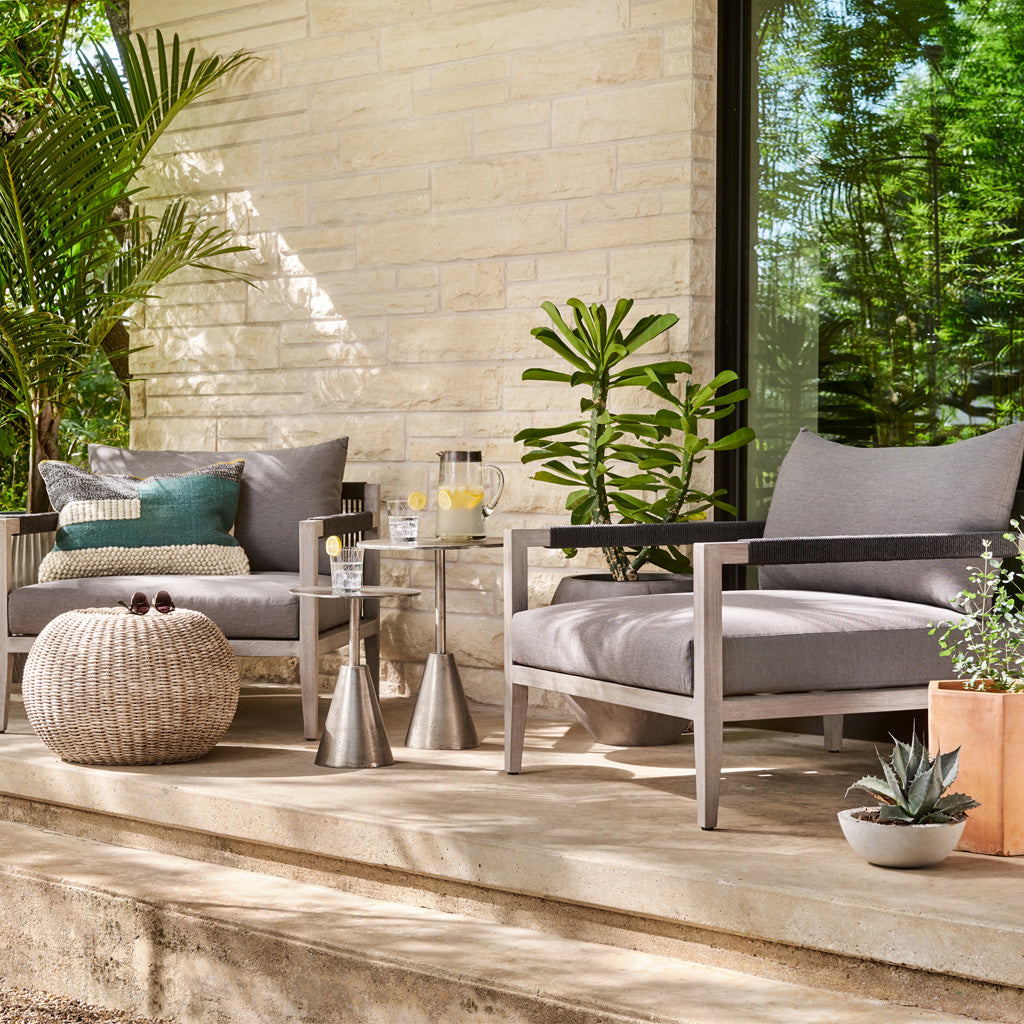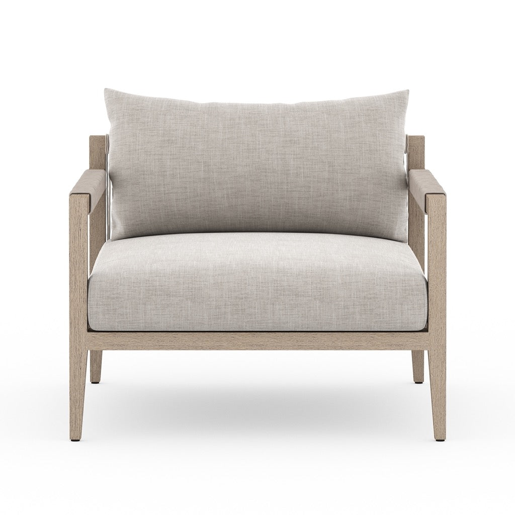 Modern materials ready a stylish silhouette for the outdoors. Washed brown teak forms a clean frame for UV-resistant and water-repellent Sunproof fabric. Cover or store indoors during inclement weather.