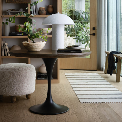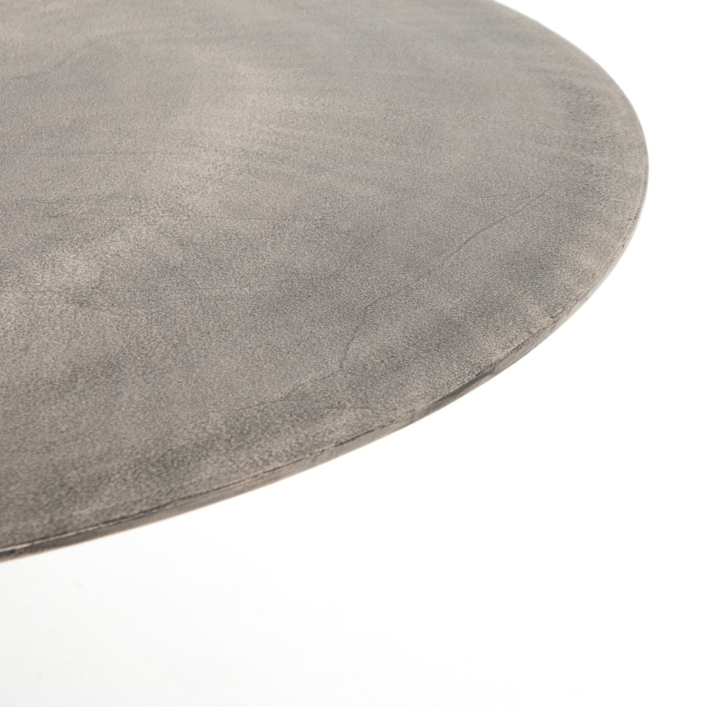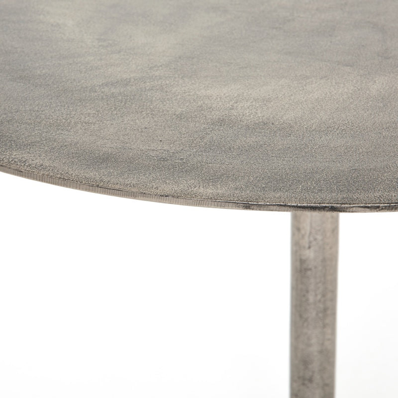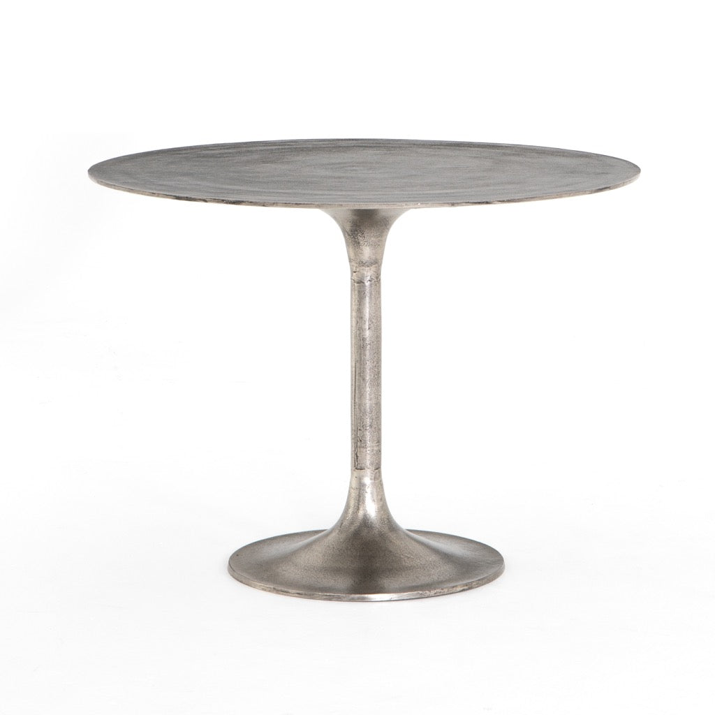 Classic tulip shaping in textural cast-aluminum makes for a modern bistro table. Finished in raw nickel to bring out alluring highs and lows, indoors or out. Cover or store inside during inclement weather and when not in use.