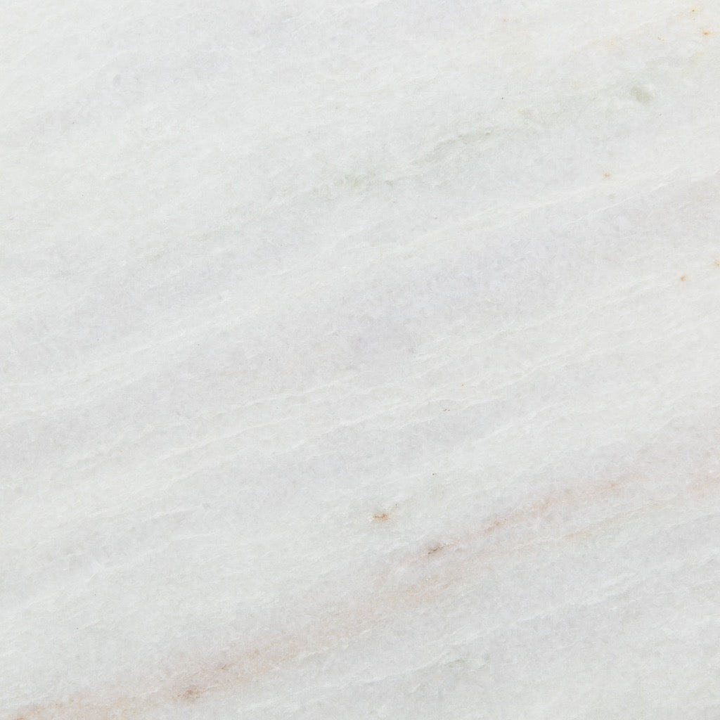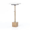 A heavy, acid-etched steel block anchors a telescoping base finished in antique brass and a gleaming white marble top. Adjust up or down to hold drinks beside a sofa, or as a pedestal for a treasured object. Unique marks and slight variations in the design may occur as part of the etching process. Height adjusts from 20" to 26" with ease.