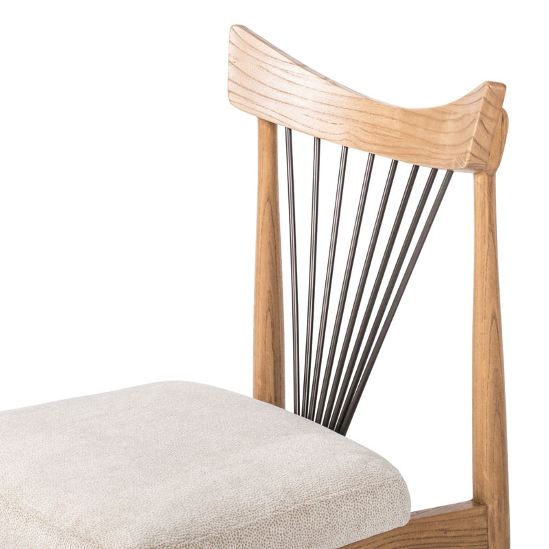 Light, honey-finished oak forms a shapely wing-style frame inspired by mid-century décor. Rear spindles of gunmetal-finished iron add unique intrigue, while upholstered seating of high-performance fabric meets comfort with practicality.