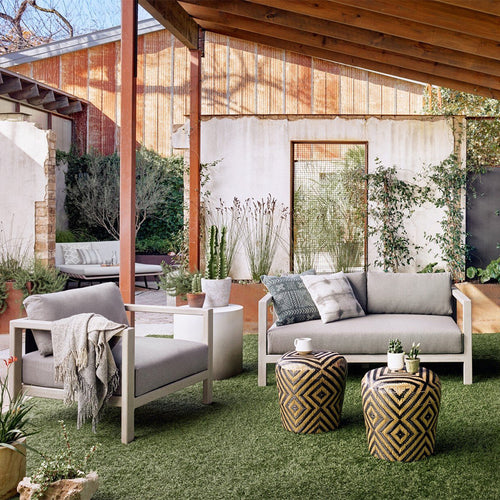 A timeless addition to any outdoor setup, with neutral back straps for added texture and intrigue. Sturdy aluminum forms a wide clean frame for deep cushioning in UV-resistant, water-repellent Sunproof fabric. Cover or store indoors during inclement weather.