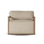 A timeless look, complementary to any style. Simple, open FSC®-certified teak framing softens the edges of this outdoor swivel chair, paired with a fixed seat cushion and removable back. Finished with a 360 inset swivel beneath the plinth base. Cover or store indoors during inclement weather and when not in use. Our Weatherproof Outdoor Chair Cover in size medium fits this chair.