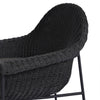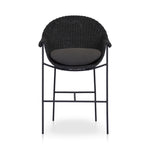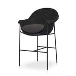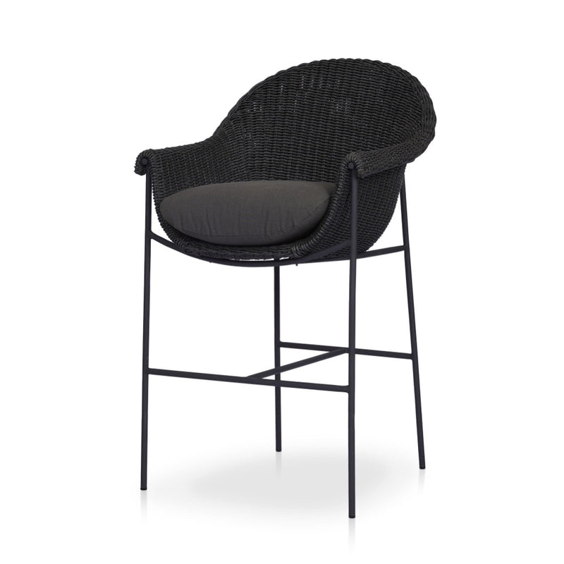 With a curvy silhouette and classic rolled arms, a woven frame brings modern sensibility to this vintage-inspired outdoor counter stool, with an airy iron cradle base for a beautiful balance of scale. Paired with a fully upholstered cushion for a comfortable sit. Cover or store indoors during inclement weather and when not in use.