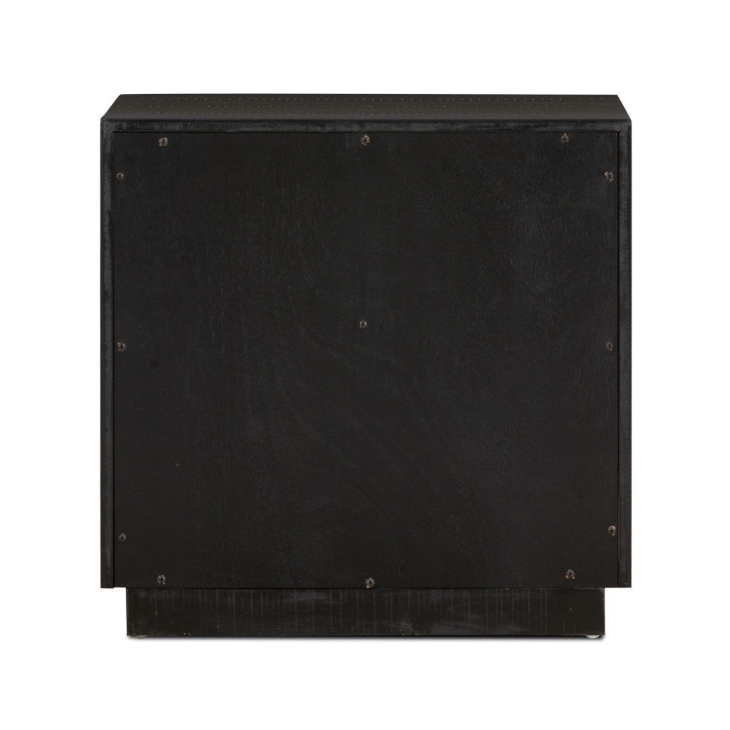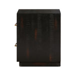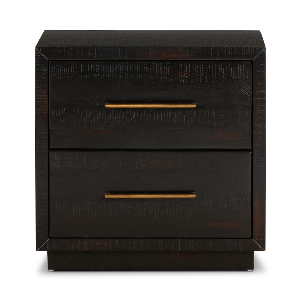 Simple sophistication with a modern edge. Solid acacia forms clean lines to lighten the natural depth of a burnished black finish. Brass-finished hardware adds a sleek touch to dual drawers. Perfect in pairs.