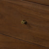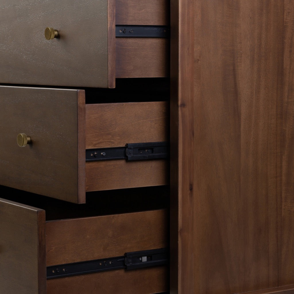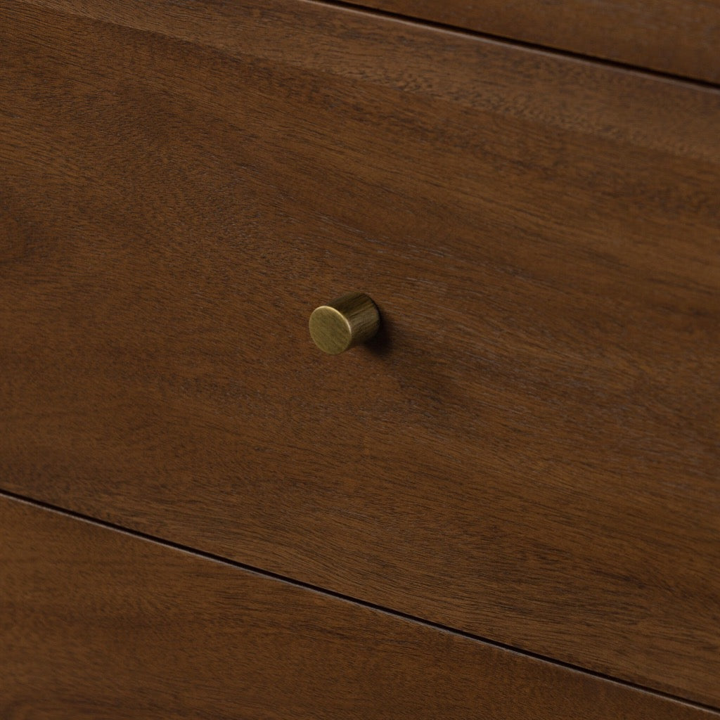 A simple, heavy wood Parsons-style dresser with 10 varied sized drawers for ample storage. Finished in solid ash with brass hardware. This item complies with the STURDY Act.