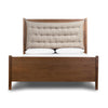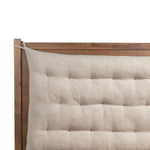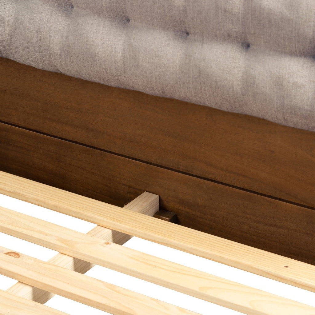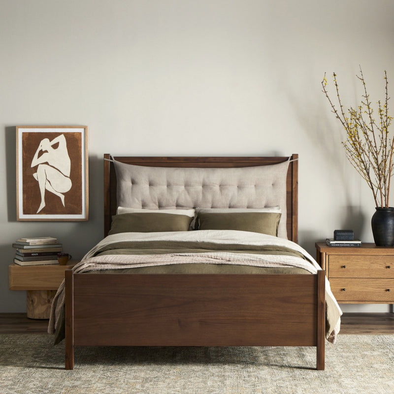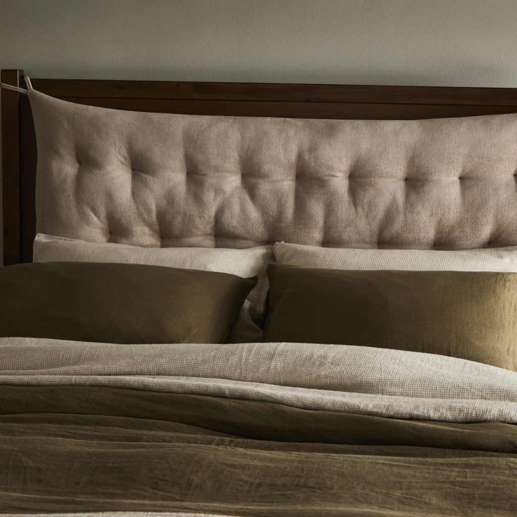 A simple, heavy wood bed frame with a removable sling cushion in a neutral fabric with blind button tufting. Choose the all-wood look or opt for a softer look with the pillow. The cushion is reinforced at the corners for added durability and easily removed for cleaning.