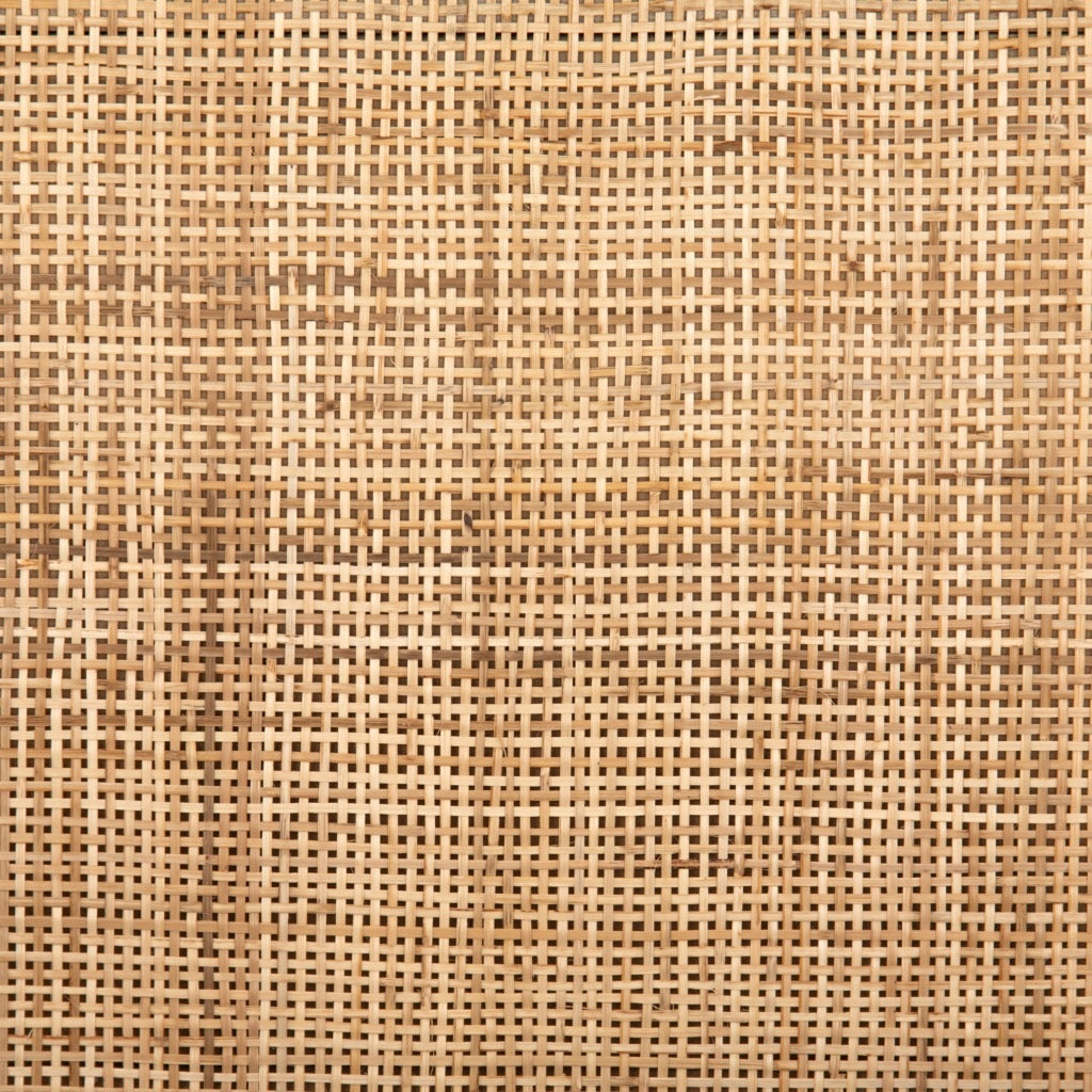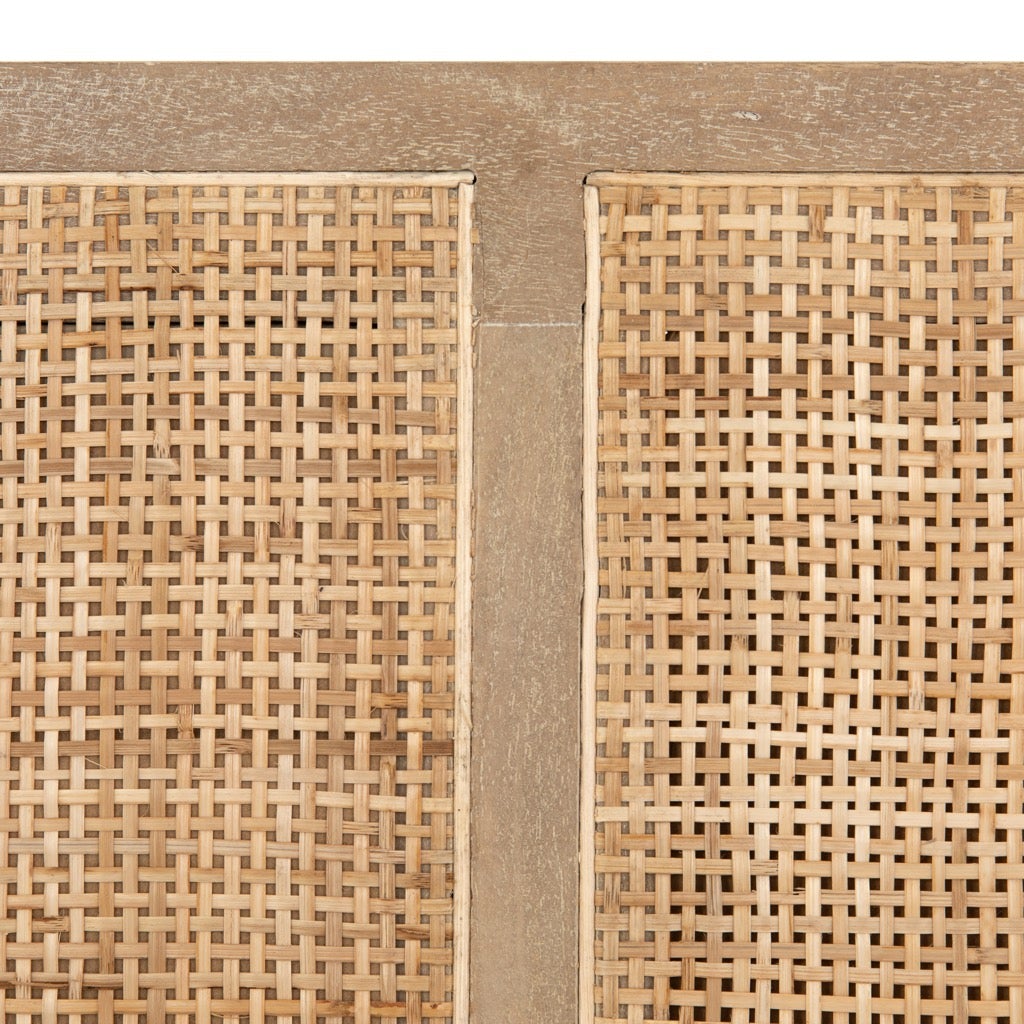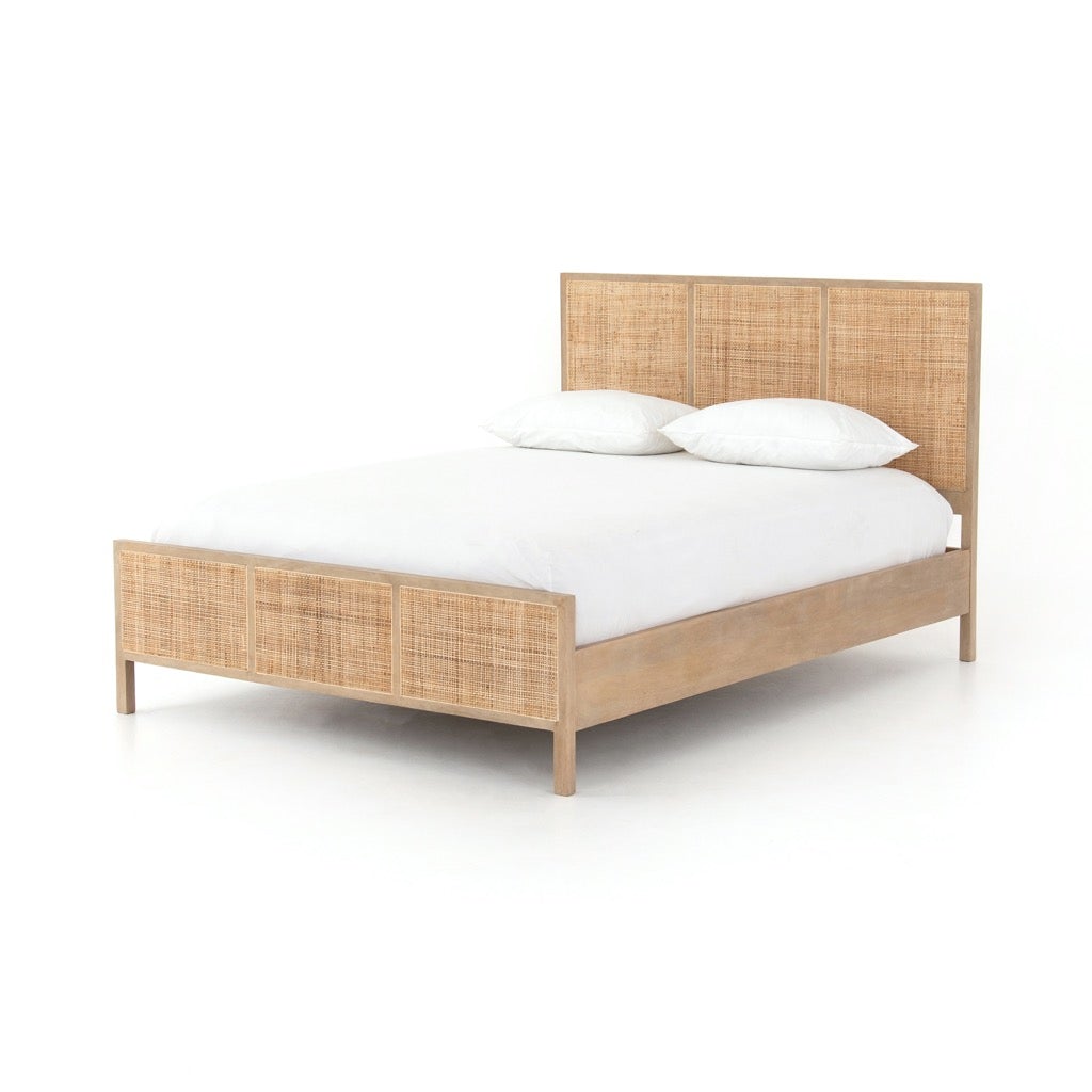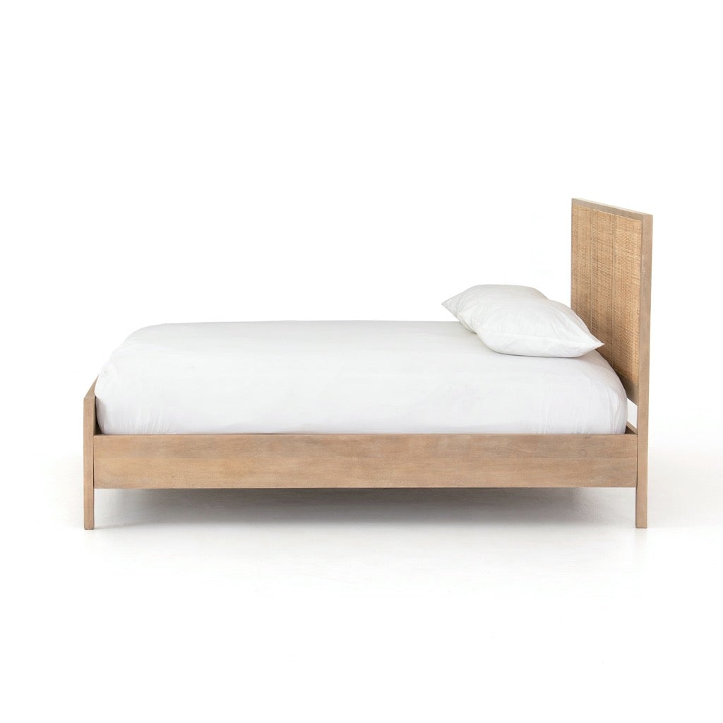 Natural mango frames woven cane, for a light, textural look with fresh organic allure. Three-panel head and footboards add a detail-rich touch.