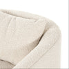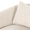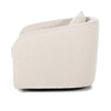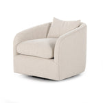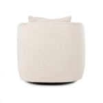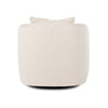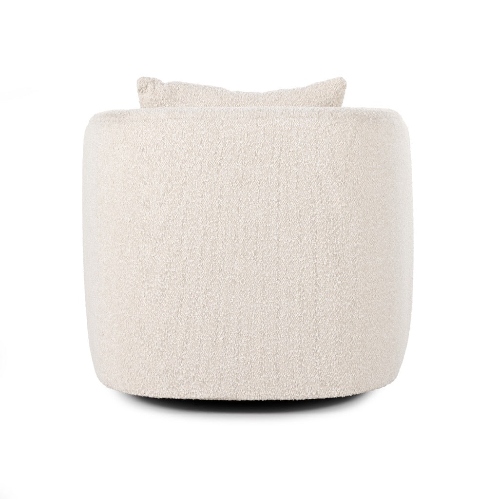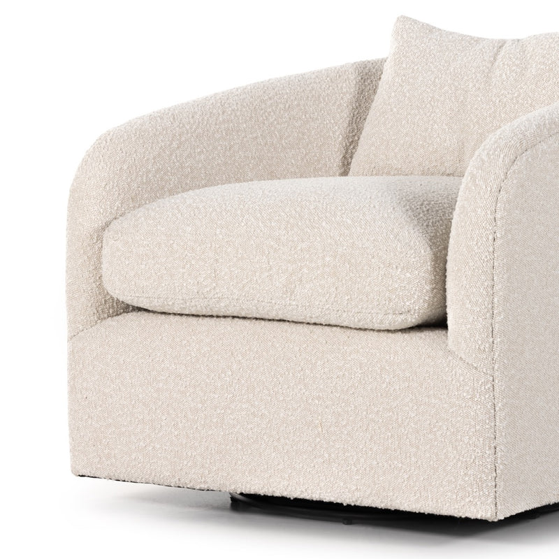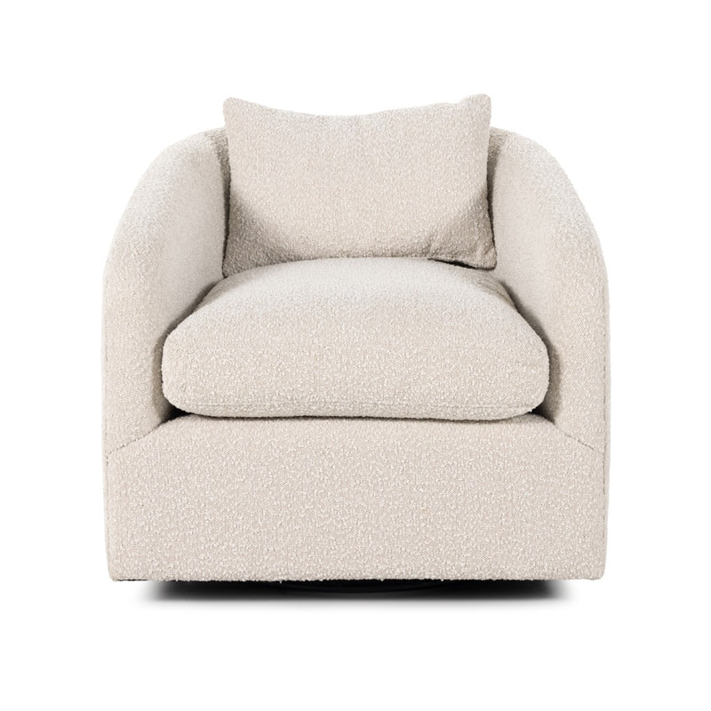 Understated luxury, soft to the touch. Cream boucle, curved arms, plush seating and single pillow create a laid-back look, while a hidden swivel turns a traditional form into something novel.