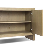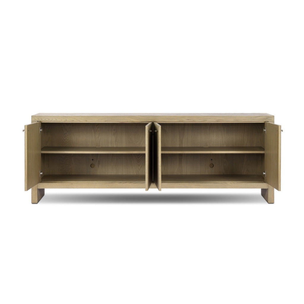 This sideboard pairs a waterfall-inspired leg design with large slabs of resawn umber oak with small, simple hardware for a piece that is both modern and understated.