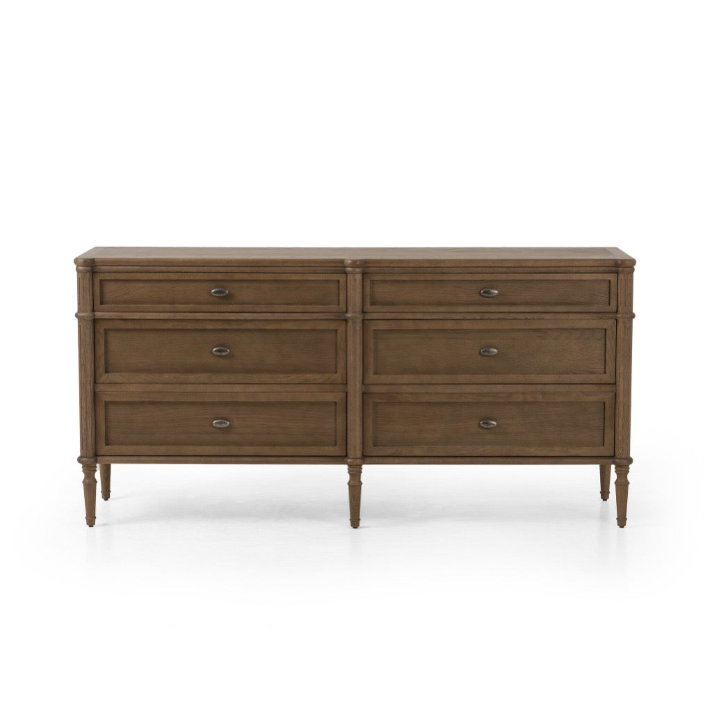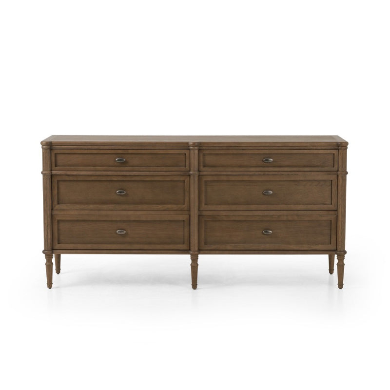 Made from toasted oak with slim legs, six drawers bring antique European vibes to modern bedroom styling. This item complies with the STURDY Act.