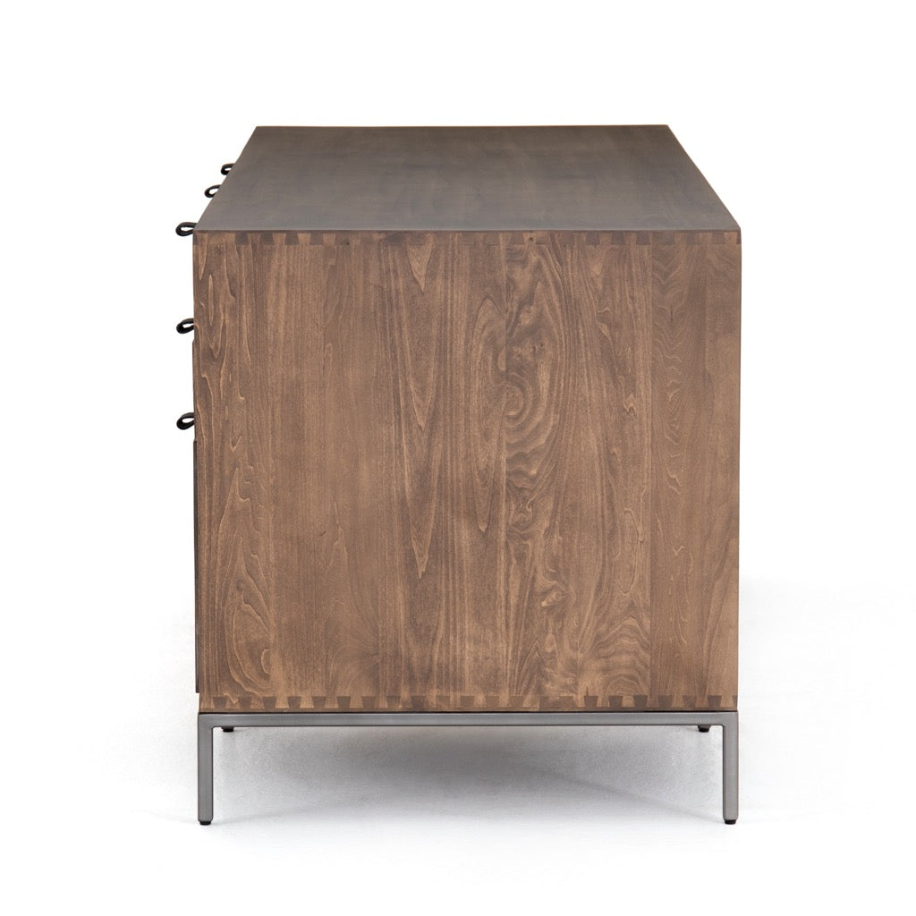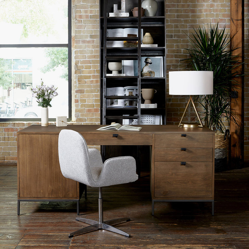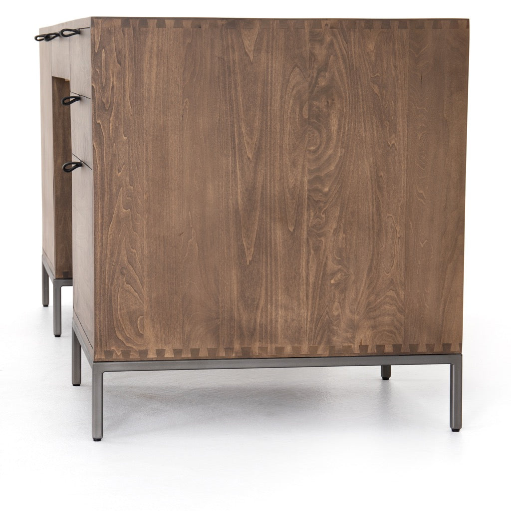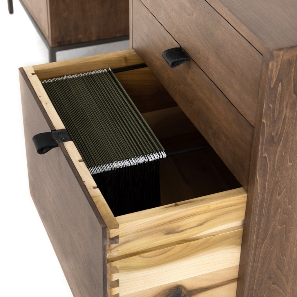 Inspired by clean mid-century design, light auburn-finished poplar offers plenty of desk storage by way of spacious drawers including one perfectly sized for file storage of legal and letter sized documents. Metal-secured leather pulls add a textural element of surprise. Cutouts for cord management.