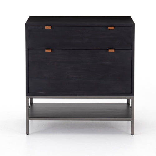 Inspired by clean mid-century design, a modular filing credenza of black-finished solid poplar brings roomy storage space to the modern office, with a fully finished back pus metal-secured leather pulls for an element of surprise. Great solo or paired with matching desk or filing cabinet.
