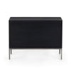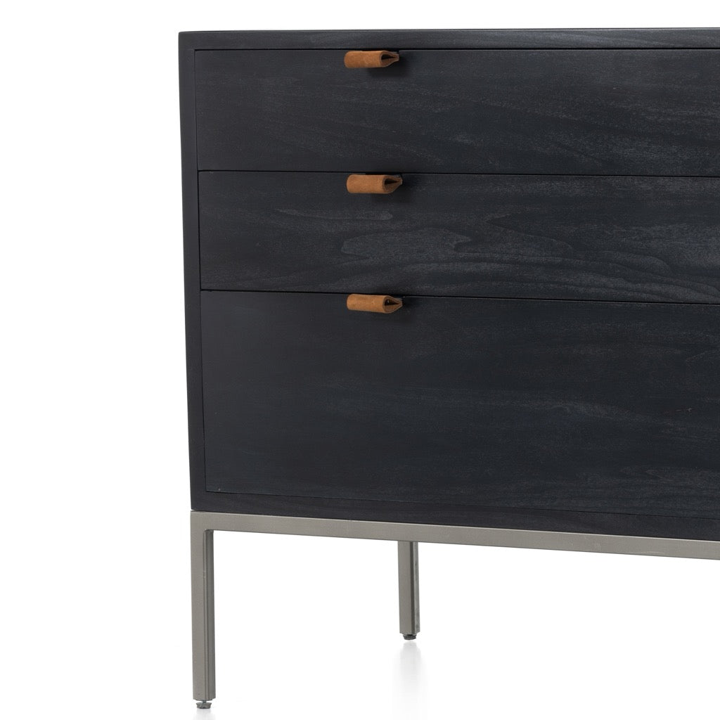 Simple style, inspired by midcentury décor. Made from black-washed poplar, a roomy three-drawer nightstand brings extra storage space to the bedside. Top-grain leather pulls add a textural finishing touch.