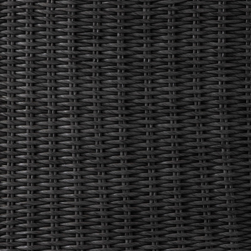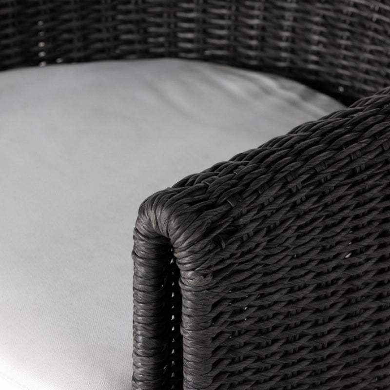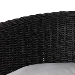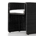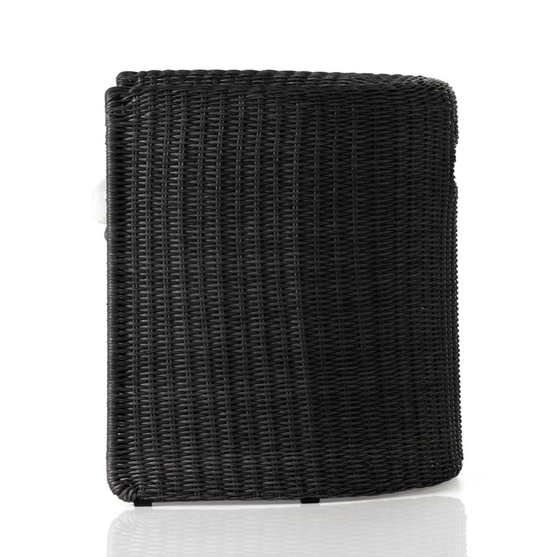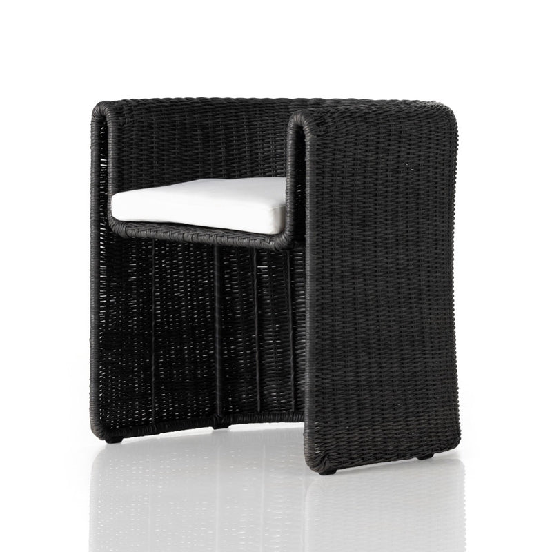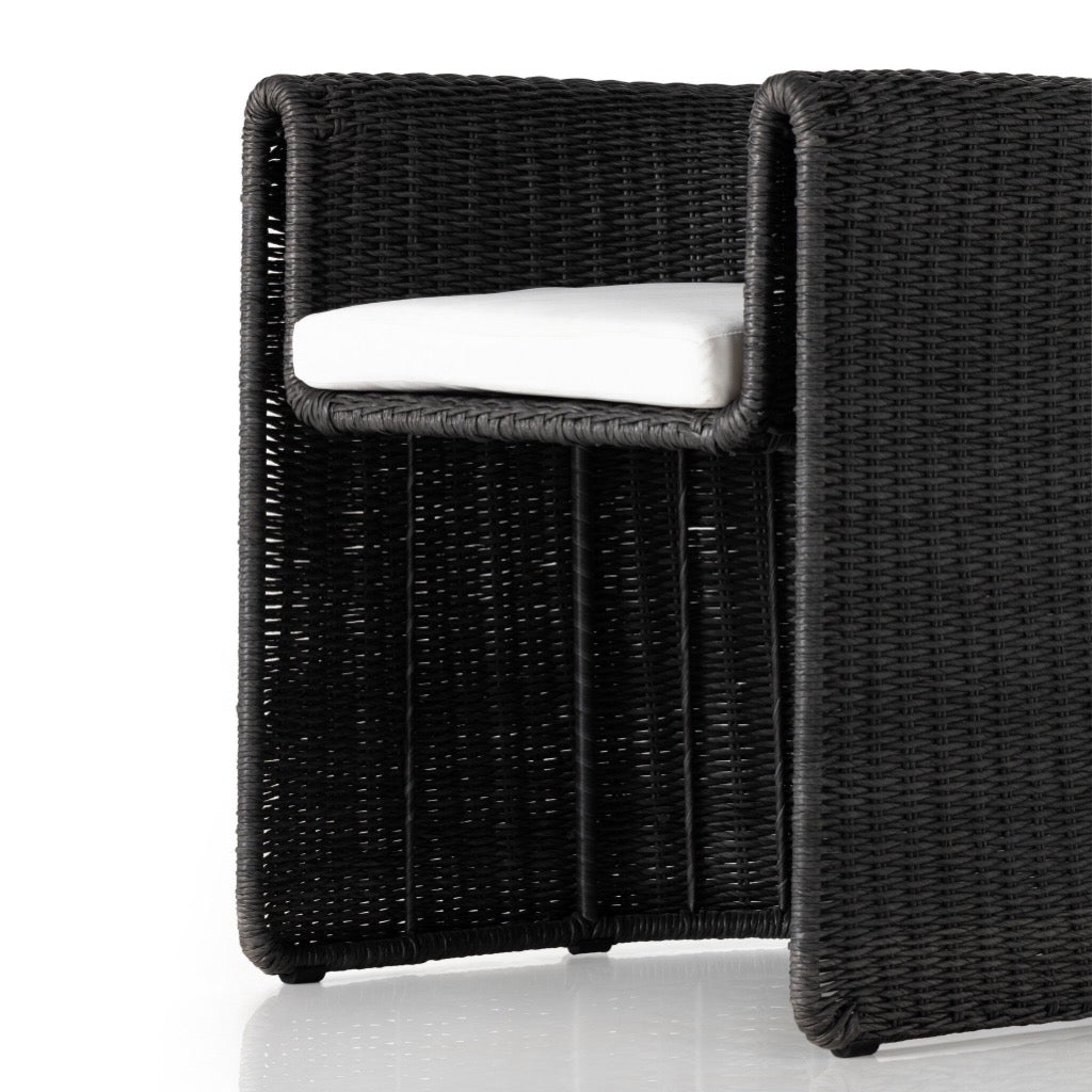 A nod to curvy Seventies styling, coal-colored woven wicker framing forms a fluid, sling-like shape and waterfall arm, with durable tufted cushioning in a versatile white. Cover or store indoors during inclement weather and when not in use.