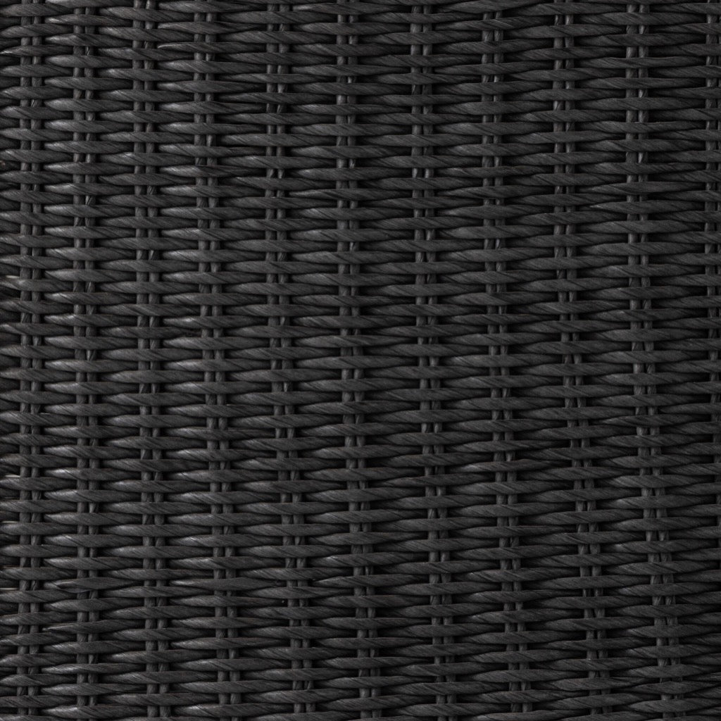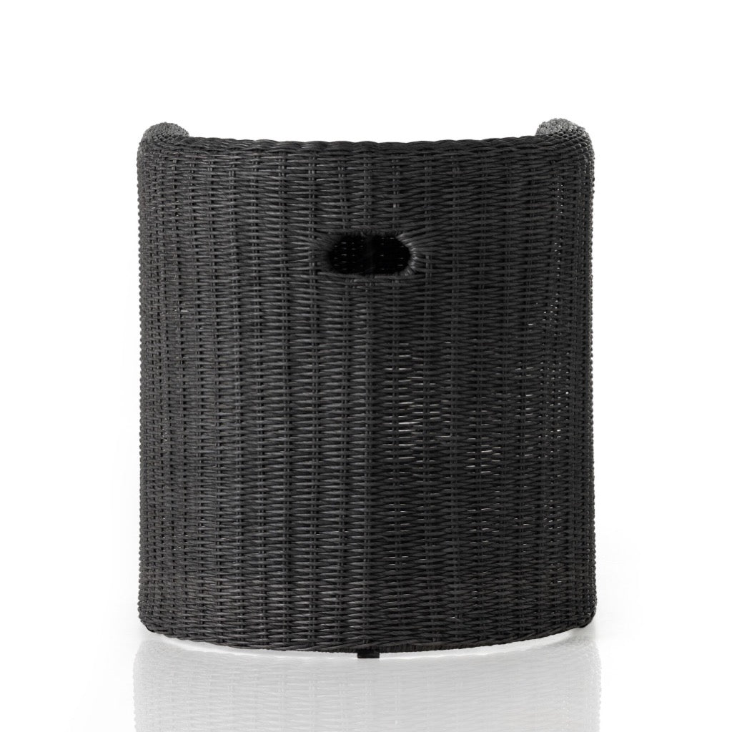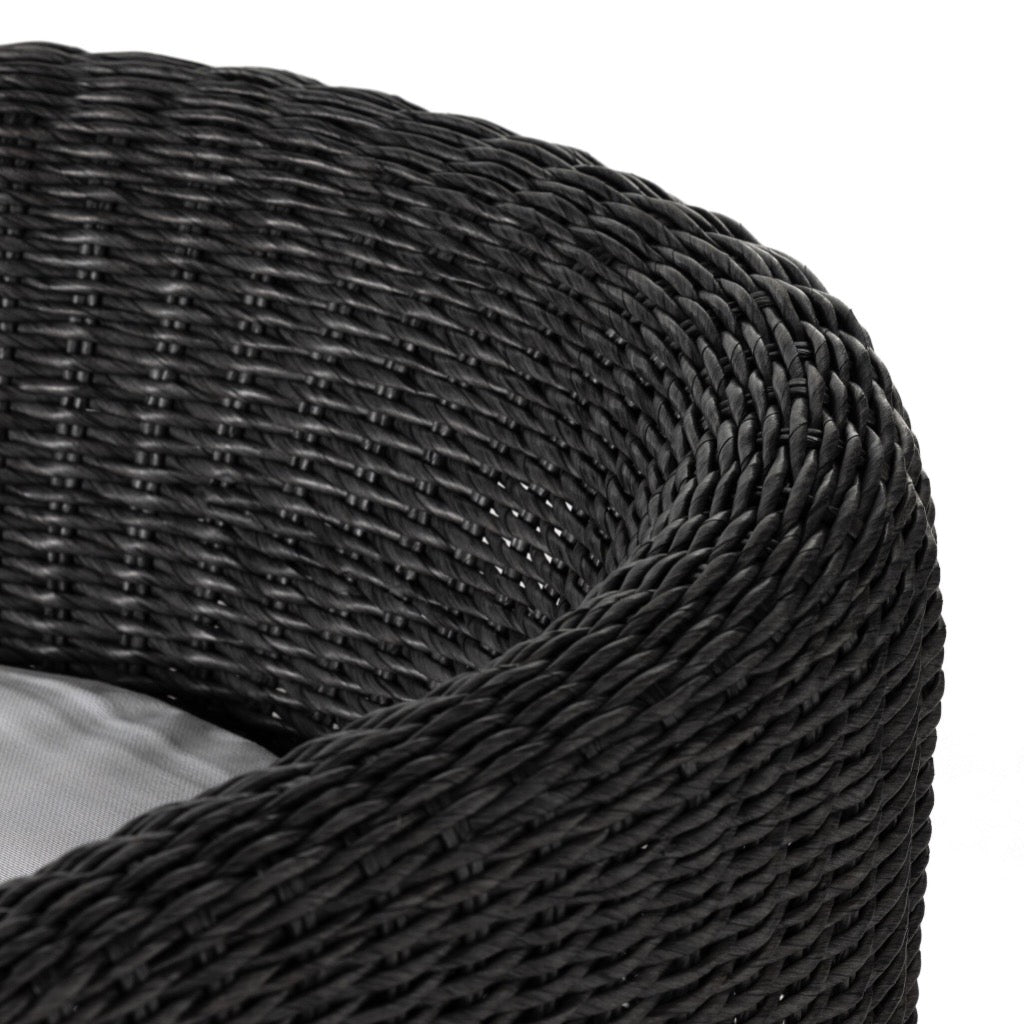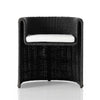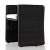 A nod to curvy Seventies styling, coal-colored woven wicker framing forms a fluid, sling-like shape and waterfall arm, with durable tufted cushioning in a versatile white. Cover or store indoors during inclement weather and when not in use.