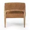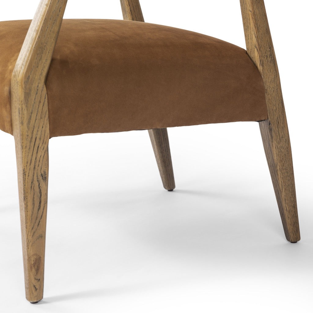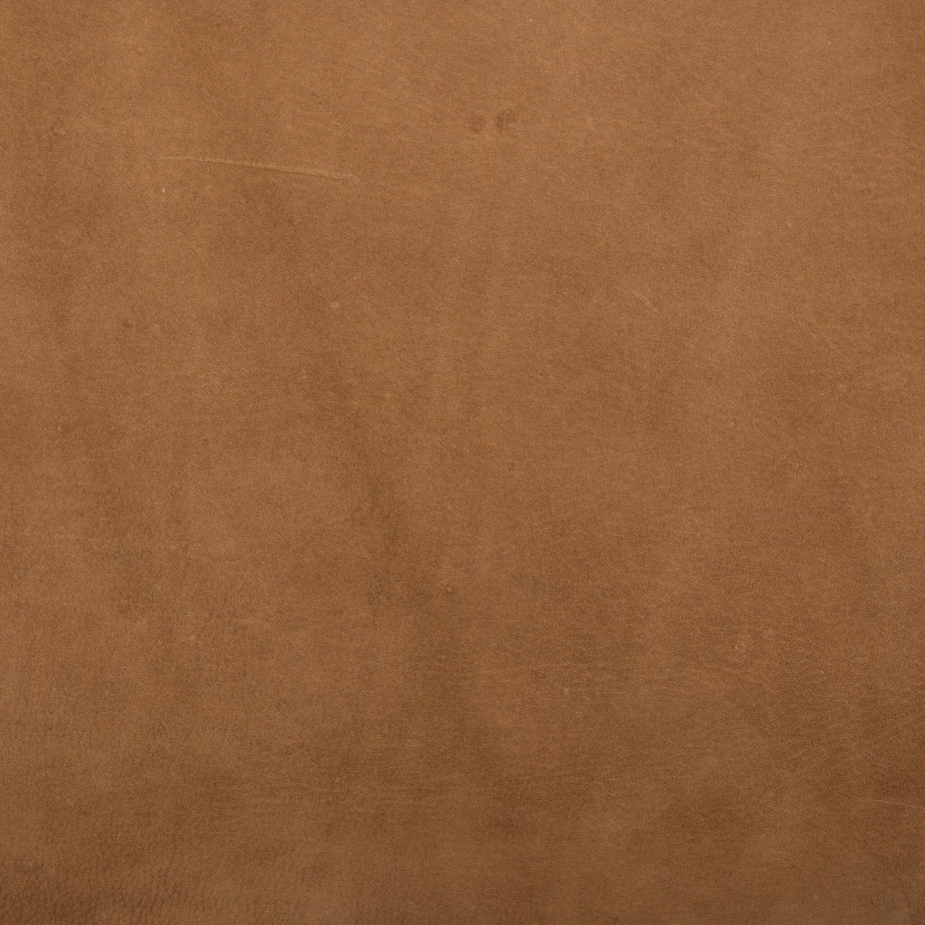 An angular frame of distressed oak holds a deep seat and striking, low-slung back. Covered in cognac-colored top-grain leather.