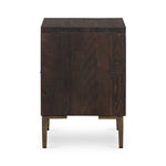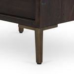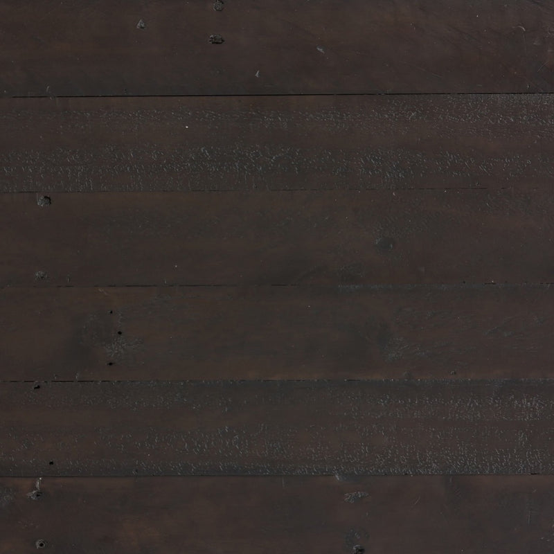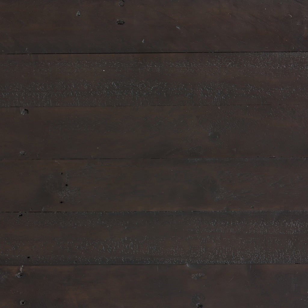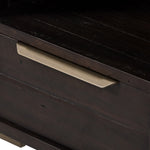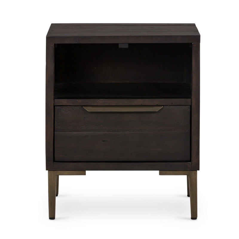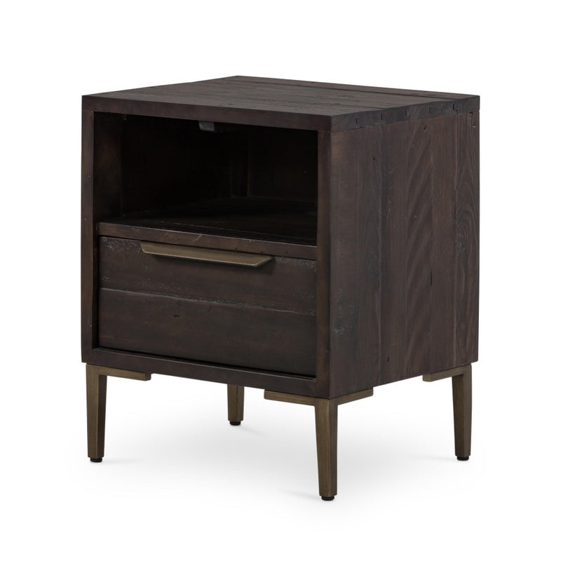 Mixed reclaimed woods take on a deep carbon tone, letting natural graining emit its innately rich character. Slim legs and flat, antique brass-finished iron hardware place a fresh spin on a streamlined form. Drawer and cubby for handy bedside storage.