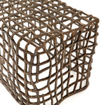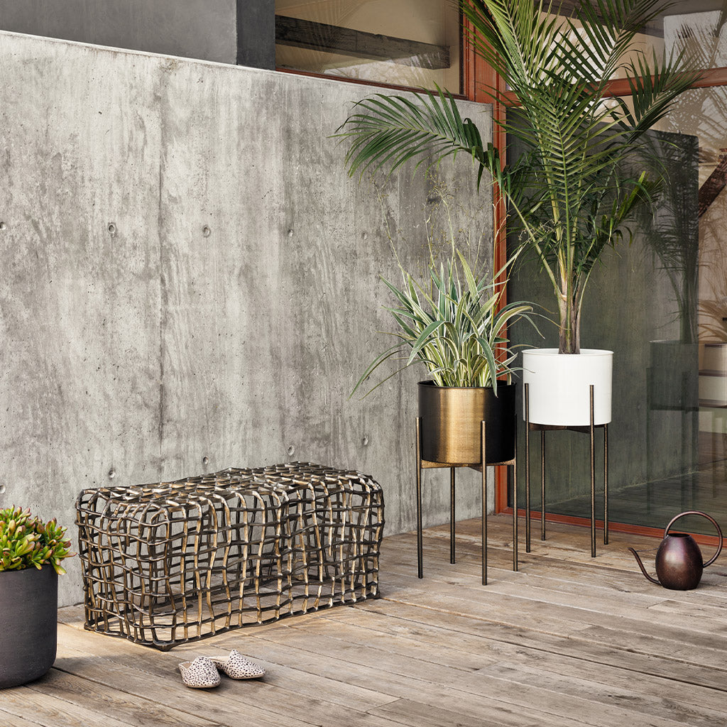 Aged bronze-finished aluminum forms a fluid, cage-like bench, for a forward-thinking look with clever distinction, indoors or out. Cover or store indoors during inclement weather and when not in use.